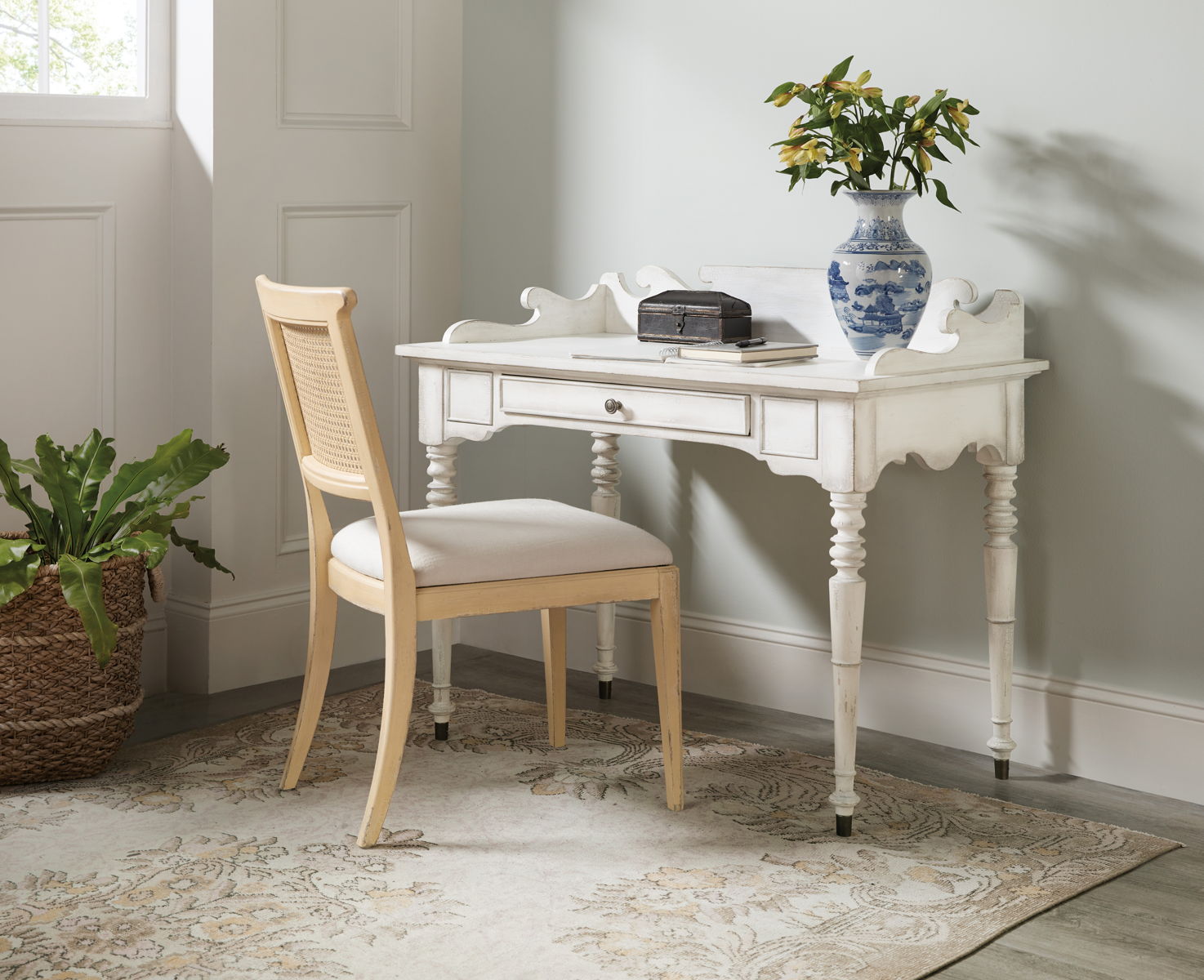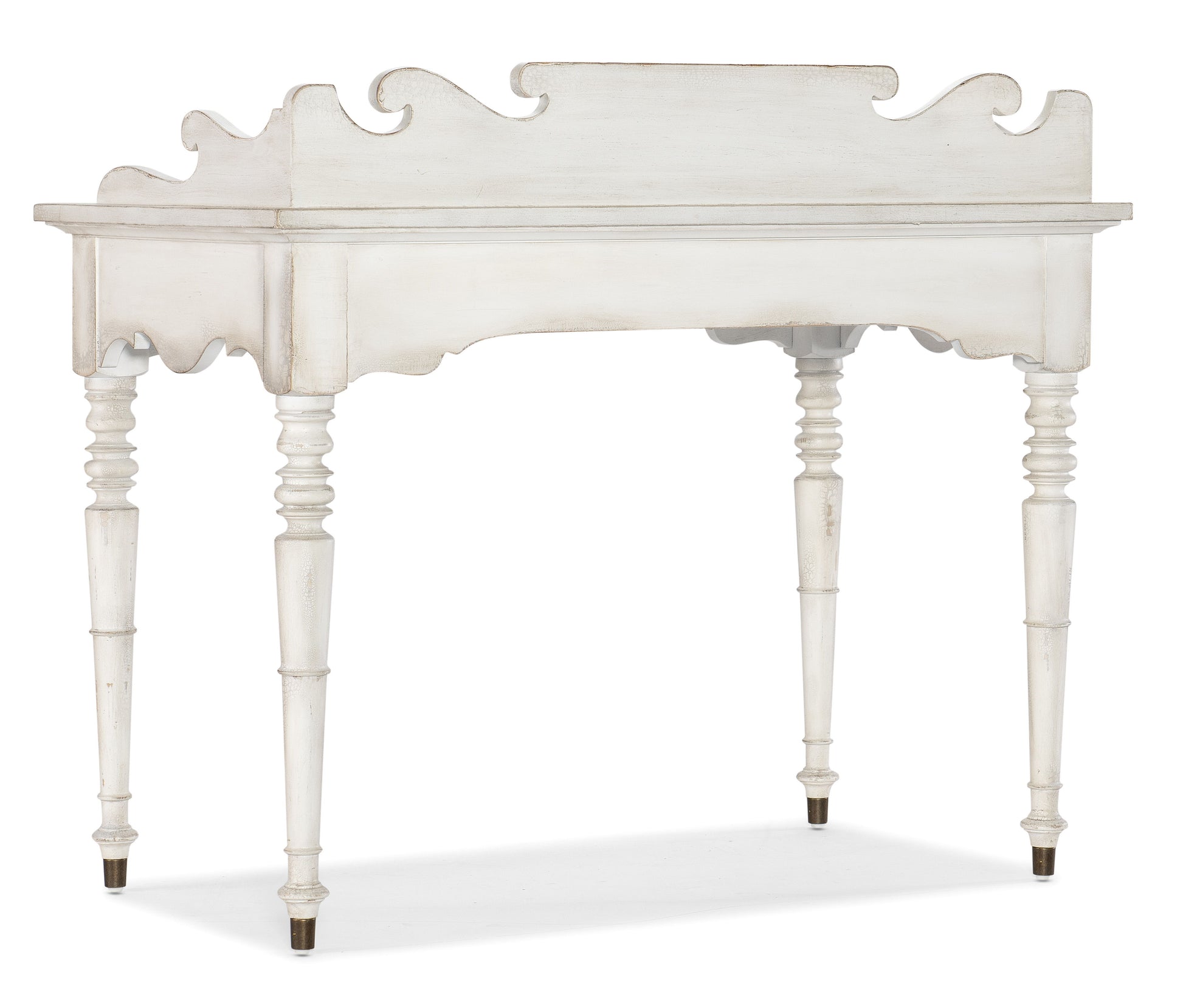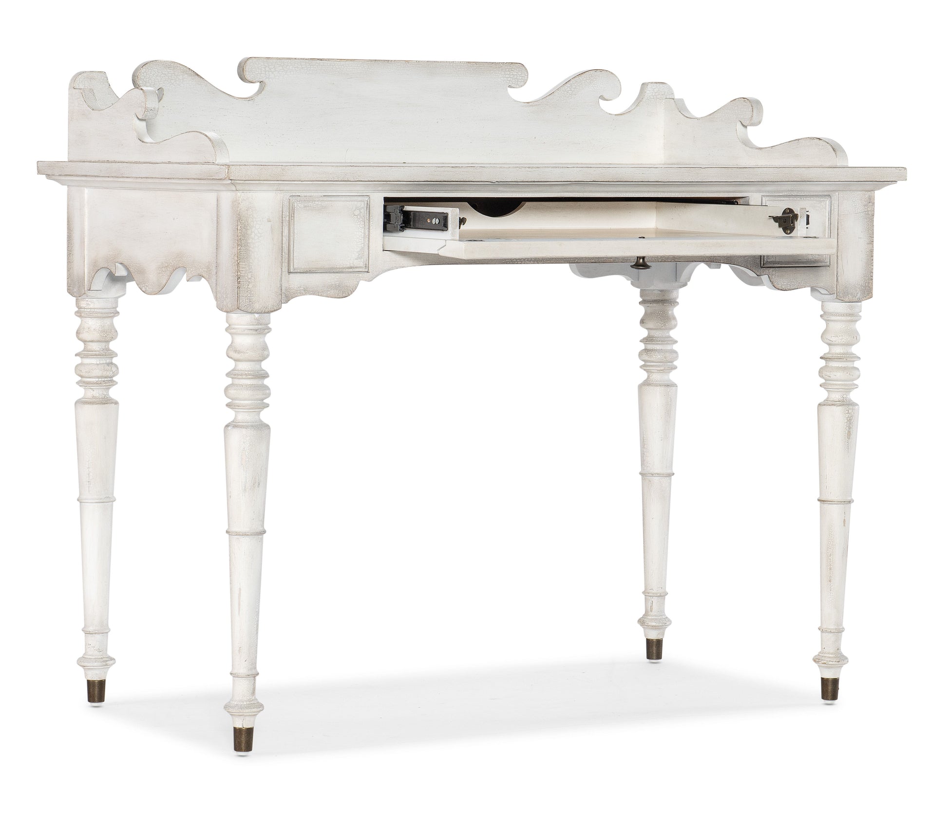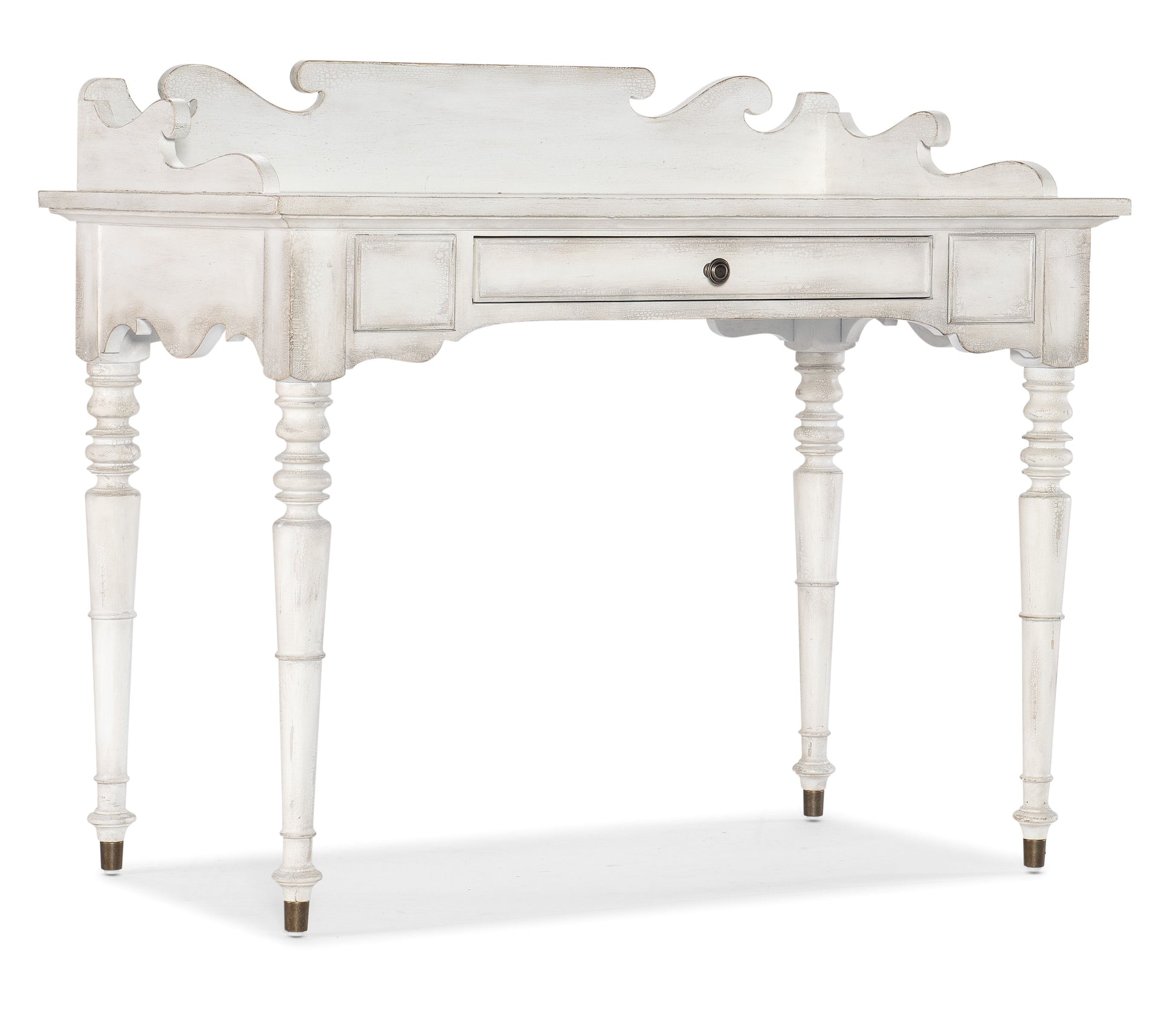 With the warm venerable beauty of antiquities and treasures from the past, the Charleston Writing Desk has a decorative scrolled gallery rail along the back and sides, a solid-wood edge top and bronze metal ferrules on the turned legs. Crafted of Cherry Veneers, it is finished in a patina with subtle distressing for an heirloom quality. Antique pewter round knob hardware.