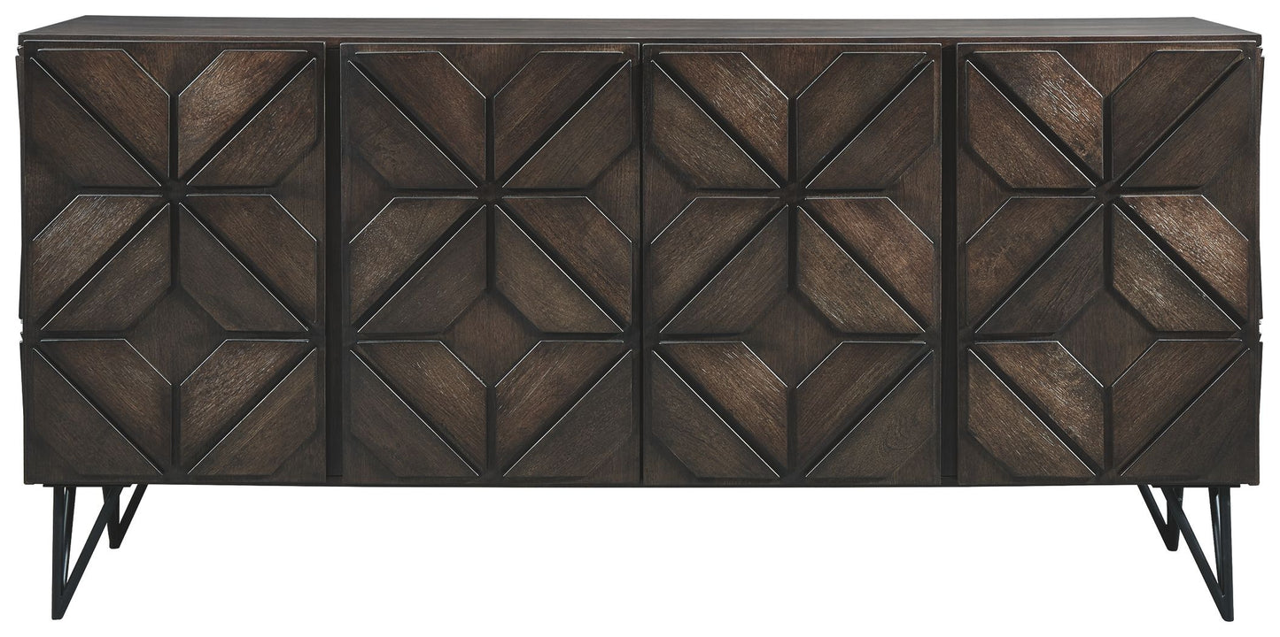 Entertain the possibilities with this extra large TV stand. Proving that furniture can be an art form, this sleek, chic cabinet stand—which accommodates up to 75" TVs—stands out from the crowd with a geometric overlay design that incorporates so much dimension. Adjustable shelving and cutouts for wire management make it highly accommodating. What's more, this TV stand works equally well as a dining room server or entryway console. How's that for staying power?