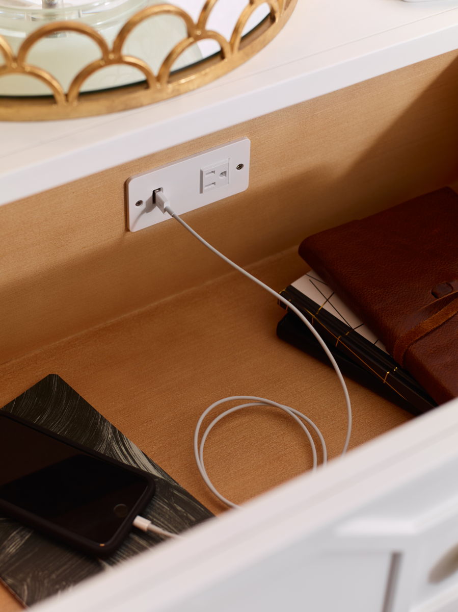 Featuring 2 drawers with English dovetail fronts and backs as well as an outlet with a USB port. Rachael Ray’s Chelsea nightstand is a glamorous, sophisticated piece that brings her fashion-forward taste to your home. Sure to add a high-end look to any setting, the clean, transitional lines of the Bright White finish are offset with Soft Gold Finish Knob hardware and base. A decorative honeycomb lattice pattern on the drawer fronts breaks the solid white plain and adds interest. Create your perfect space with Chelsea by Rachael Ray Home. Material: Select Hardwoods, Poplar Solids & Paint Grade Veneer. Color: White with Gold Accents Finish with Soft Gold Finished Knobs.