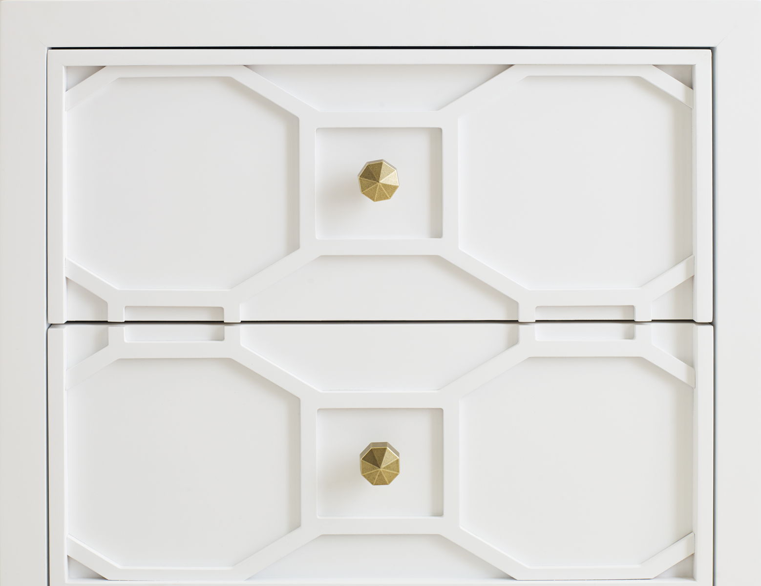Hardware: Soft Finished Knobs Material: Select Hardwoods, Poplar Solids and Paint Grade Veneer (CA Carb P2 Compliant)Drawer Construction: English Dovetail Fronts, Lap Joint Backs, Dust Bottom on Lowest Level Drawer Guides: Side Mounted, Ball-Bearing Drawer Guides Rachael's Chelsea youth collection is a glamorous, sophisticated grouping that brings her fashion-forward taste to any age. From storage to sleep to study, these modern, intriguing pieces will be loved from a young age to a college dorm room. The clean, transitional lines of the finish are offset with accents and Soft Finish Knob hardware, making each piece as warm and inviting, as it is stylish.