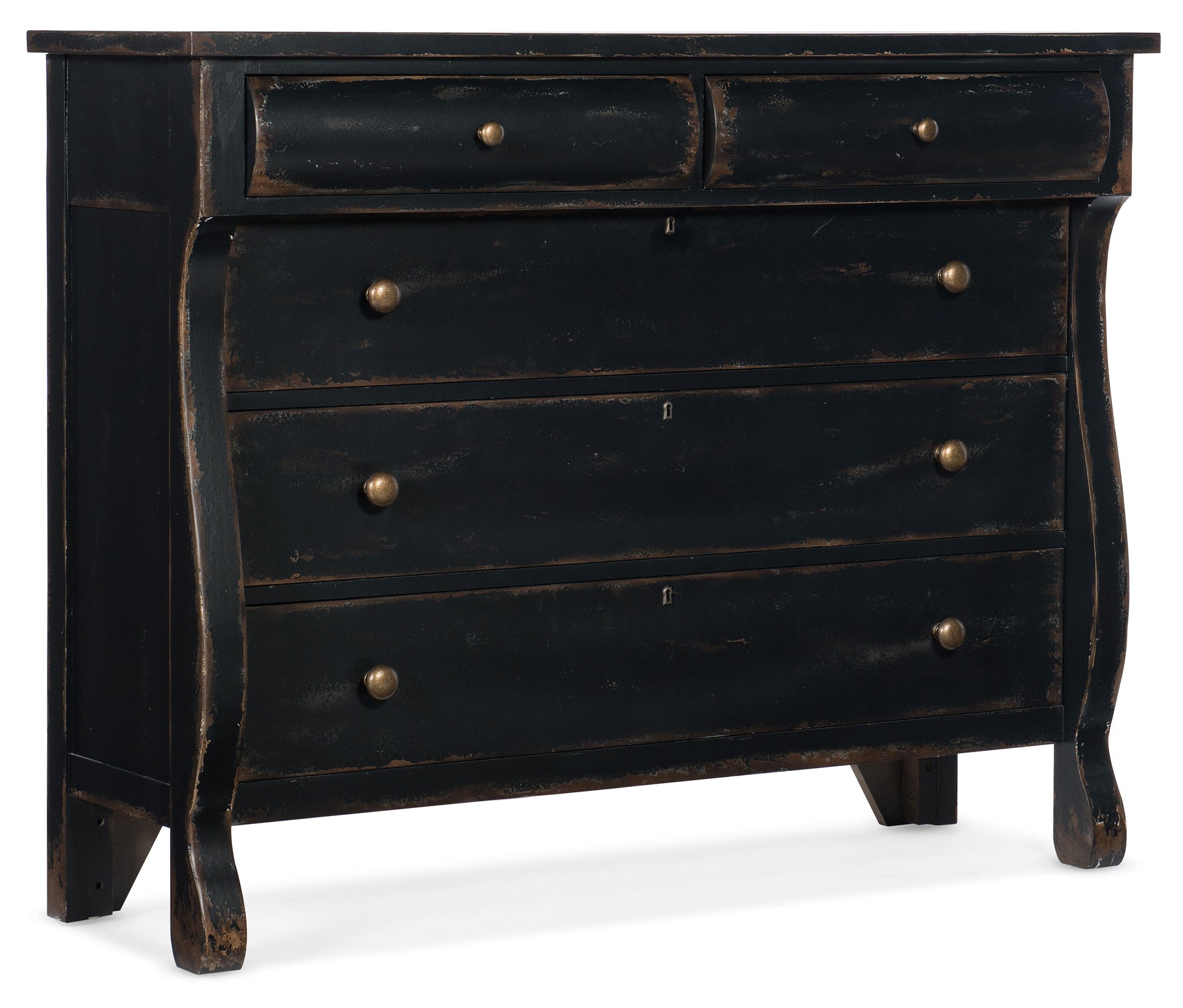 - Finish Description: Black finish. Distressing includes worm holes, rasping, multi-layer rub through and emolsion. Burnished brass hardware.