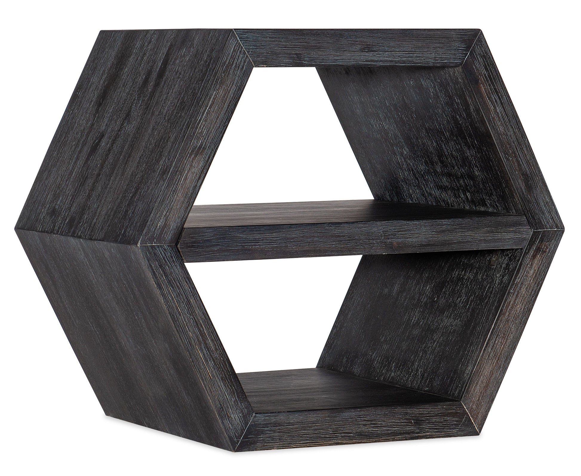 With an exotic smokey finish and stylish hexagonal shape, the Honeycomb End Table is crafted of Acacia Veneers and has one fixed shelf. The transparent black finish reveals color and grain variances in the wood.