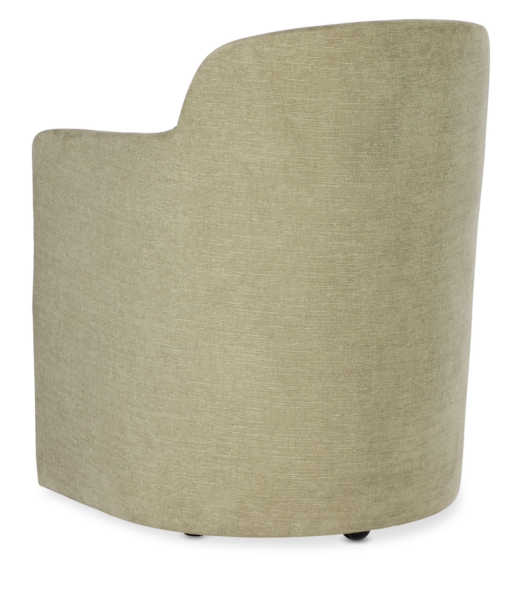 The Izabela Upholstered Arm Chair from the Commerce & Market collection combines comfort with contemporary design. Upholstered in a performance fabric with a mix of polyester, viscose, and linen, this chair features a full fabric covering on the seat, back, and outer frame. The barrel-style design and casters make it perfect for dining or office spaces, allowing mobility and style.