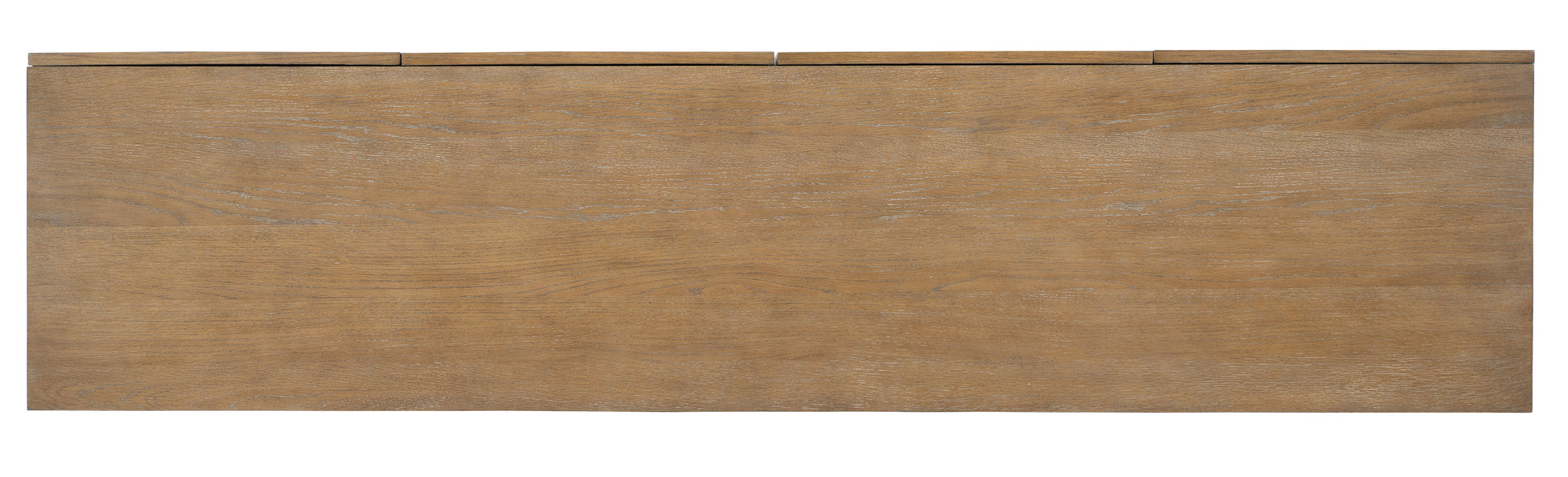 Whimsical and organic, the Pilea Entertainment Center is crafted of Oak Solids and Veneers with a light natural finish accented by inset green ceramic pulls in a lily pad design. Measuring 80 inches wide by 18 inches deep, it has four doors with soft-close hinges and touch latches. There’s one adjustable wood shelf behind each left and right door and one adjustable shelf behind the center pair of doors. Features wire management and a ventilated back panel behind all doors.