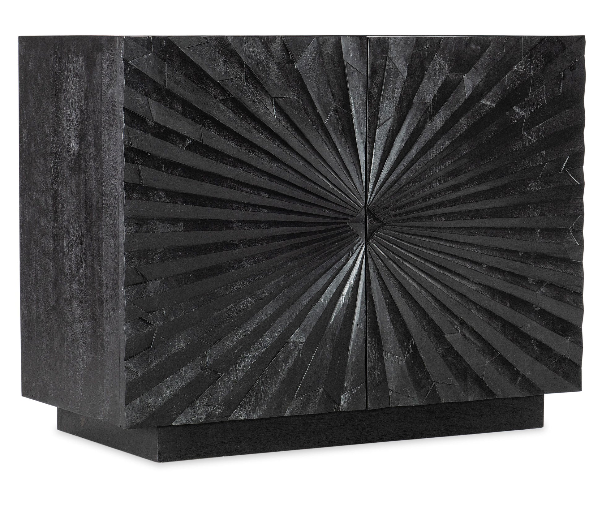 Infuse your room with energy with the Commerce & Market Two-Door Chest, featuring a star-burst motif on the door fronts. Crafted of Mango Solids, the chest has a transparent black wood finish that reveals color and grain variances for organic appeal. The doors have soft-close hinges and finger pull cut-outs and a fixed ventilated shelf behind.