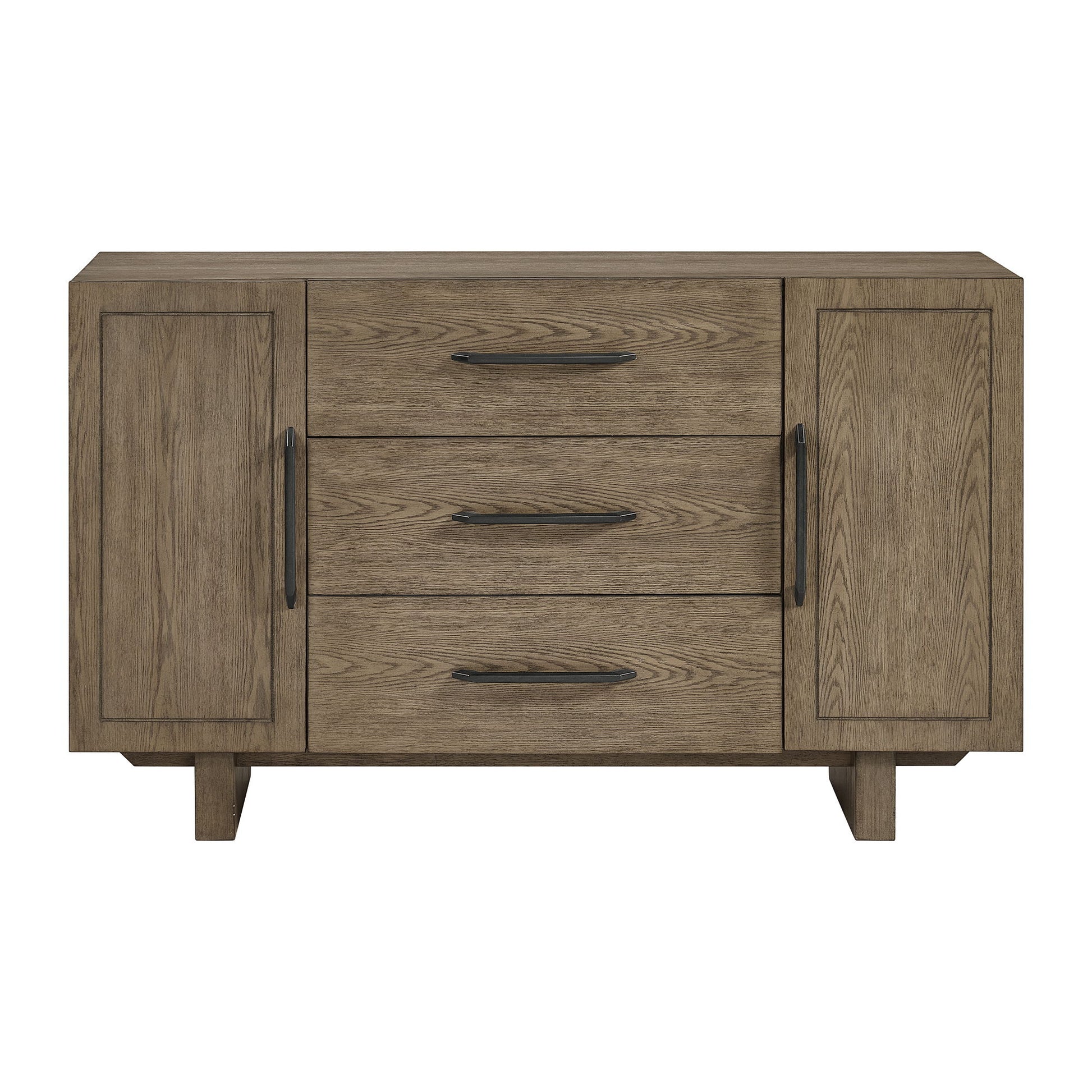 The Conner Server is a perfect blend of functionality and elegance for your dining space. Crafted with a natural oak finish, it is constructed from solid wood and MDF with an oak veneer, ensuring durability and a refined look. Featuring English dovetail construction with ball bearing glides, it offers smooth drawer operation and longevity. The server includes a wine rack in the cabinets, adding a touch of sophistication. Black felt-lined drawers protect your items, while the dark metal hardware enhances its aesthetic. The natural variations in wood and color make each piece unique. An anti-tipping kit is included for added safety.