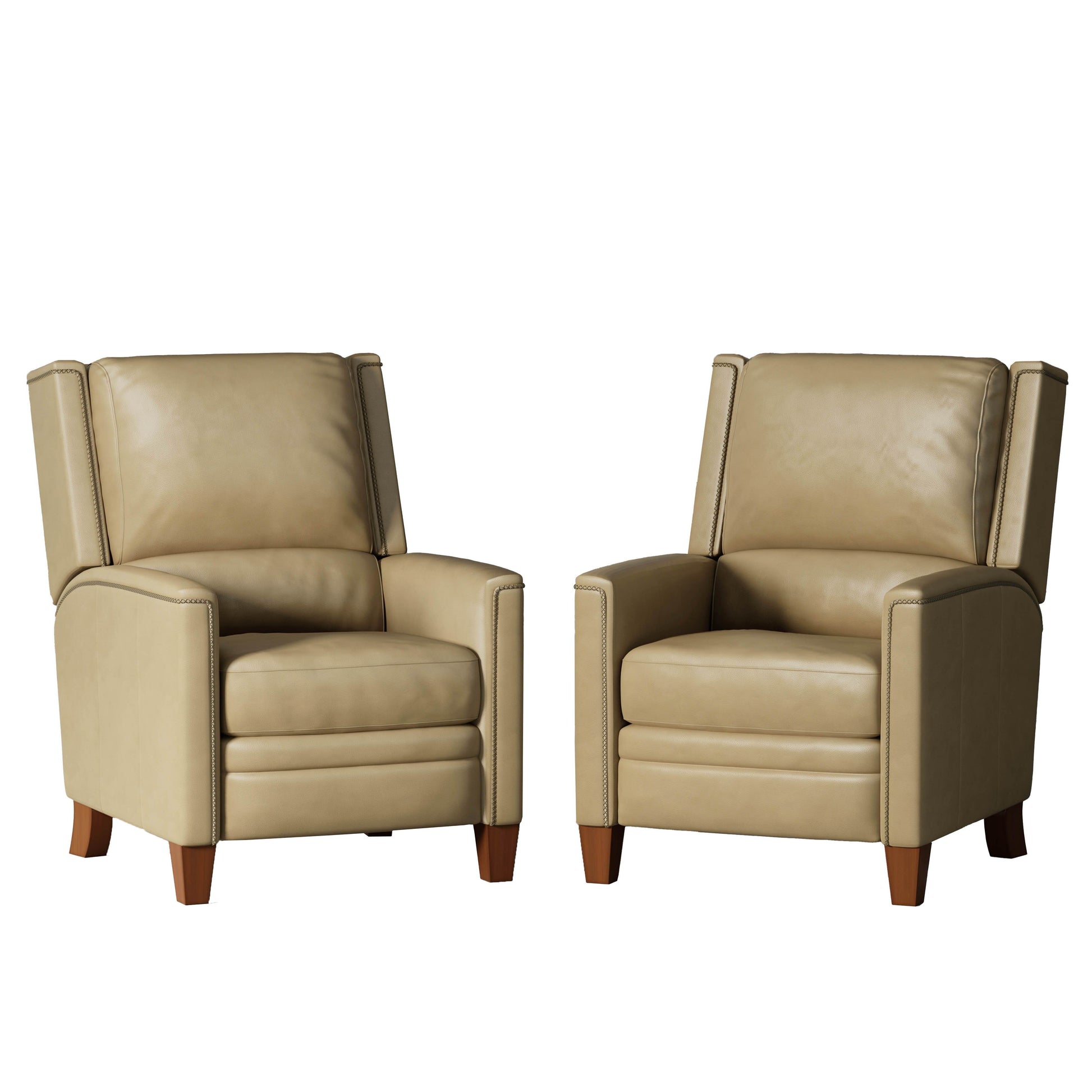 The Connor recliner has an easy manual pushback recline for relaxed sitting. It is upholstered in soft leather with a custom match, giving it a sophisticated look. The decorative twisted rope stitching adds elegance, and the high-leg design complements any room. This recliner also has a hidden extension footrest for added comfort.