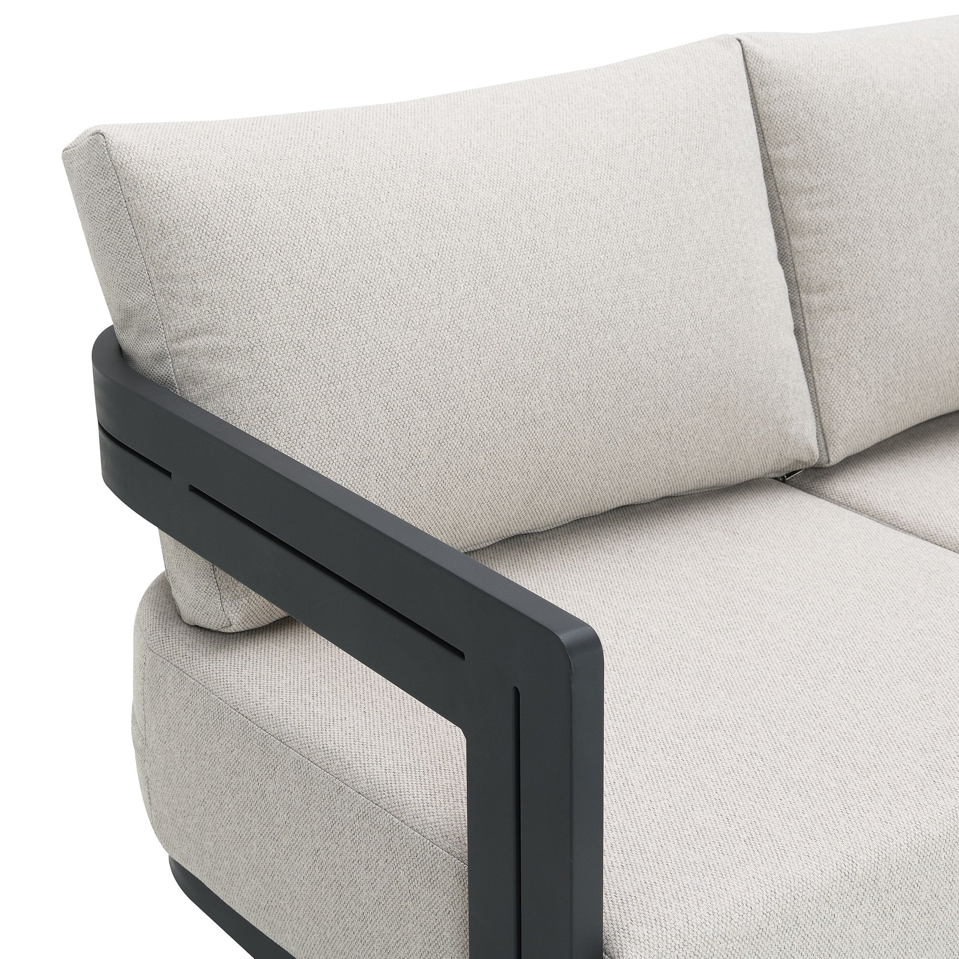 Upgrade your outdoor space with the Costa Patio Sofa. Crafted with all-weather rust-free aluminum, this piece is built to withstand the elements and maintain its sleek appearance for years to come. The comfortable beige seat and back upholstery provides a cozy seating experience, while the intricate back design adds an elegant flair to the outdoor setting. Perfect for hosting outdoor gatherings, this sofa is designed to make entertaining a breeze. Enjoy endless summer nights in style with the Costa Patio Sofa.