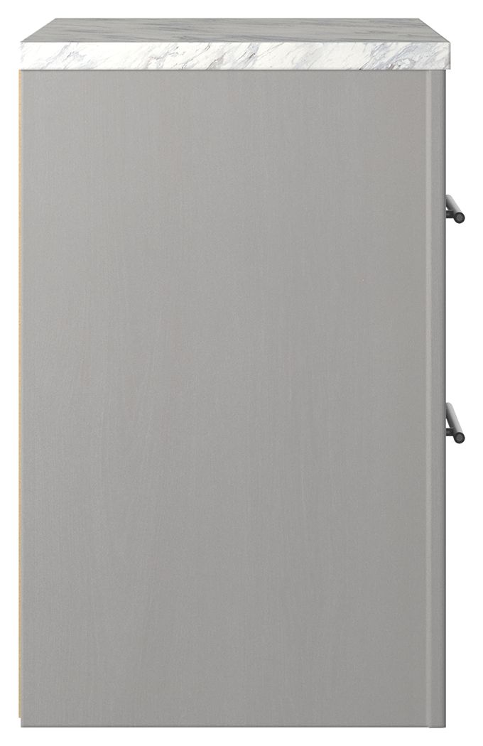 Cool, clean and casually modern. This nightstand’s wispy dove gray finish and faux Calcutta marble top set the tone for your calming sanctuary. Large linear pulls add dimension and authenticity. Two smooth-gliding drawers neatly accommodate your bedside needs.