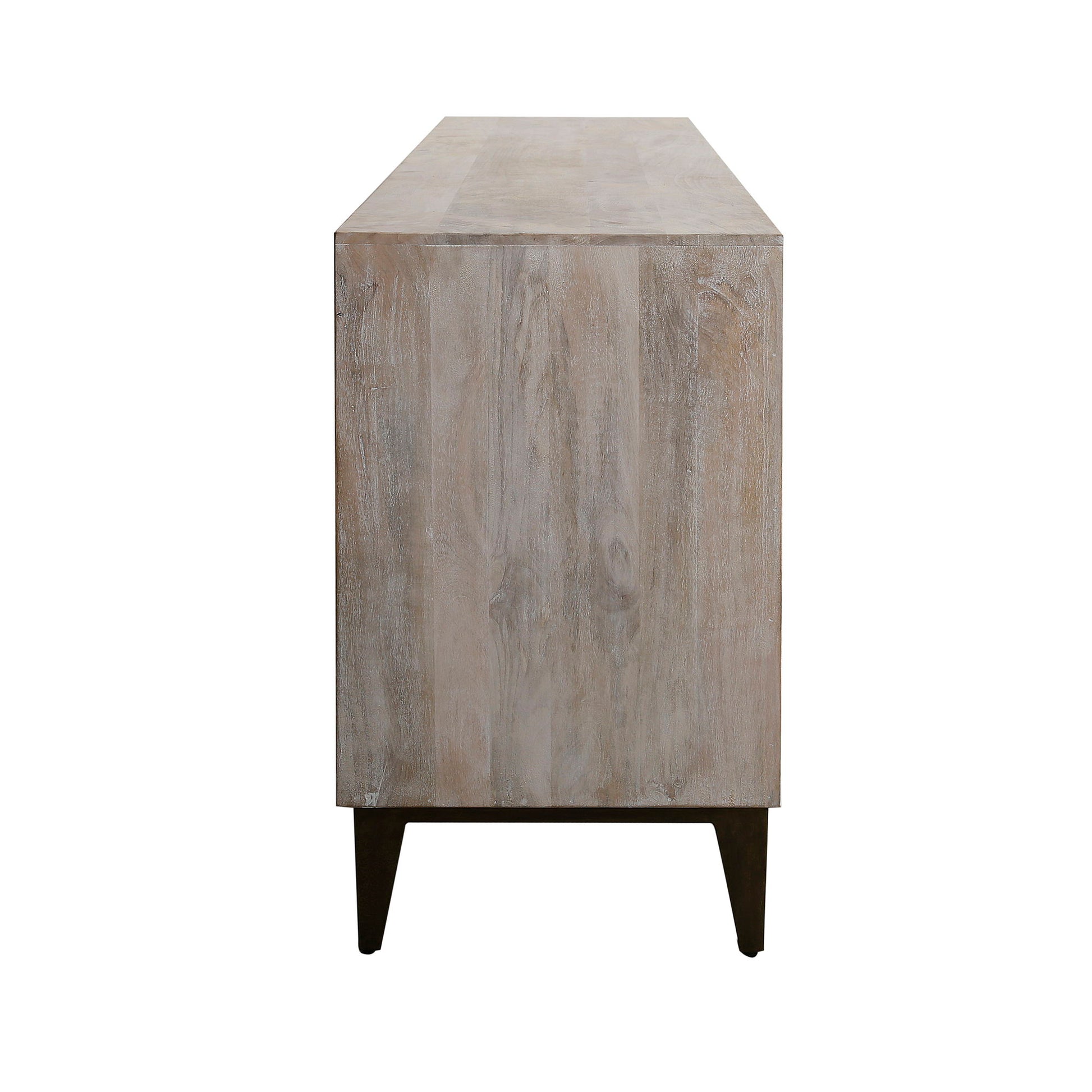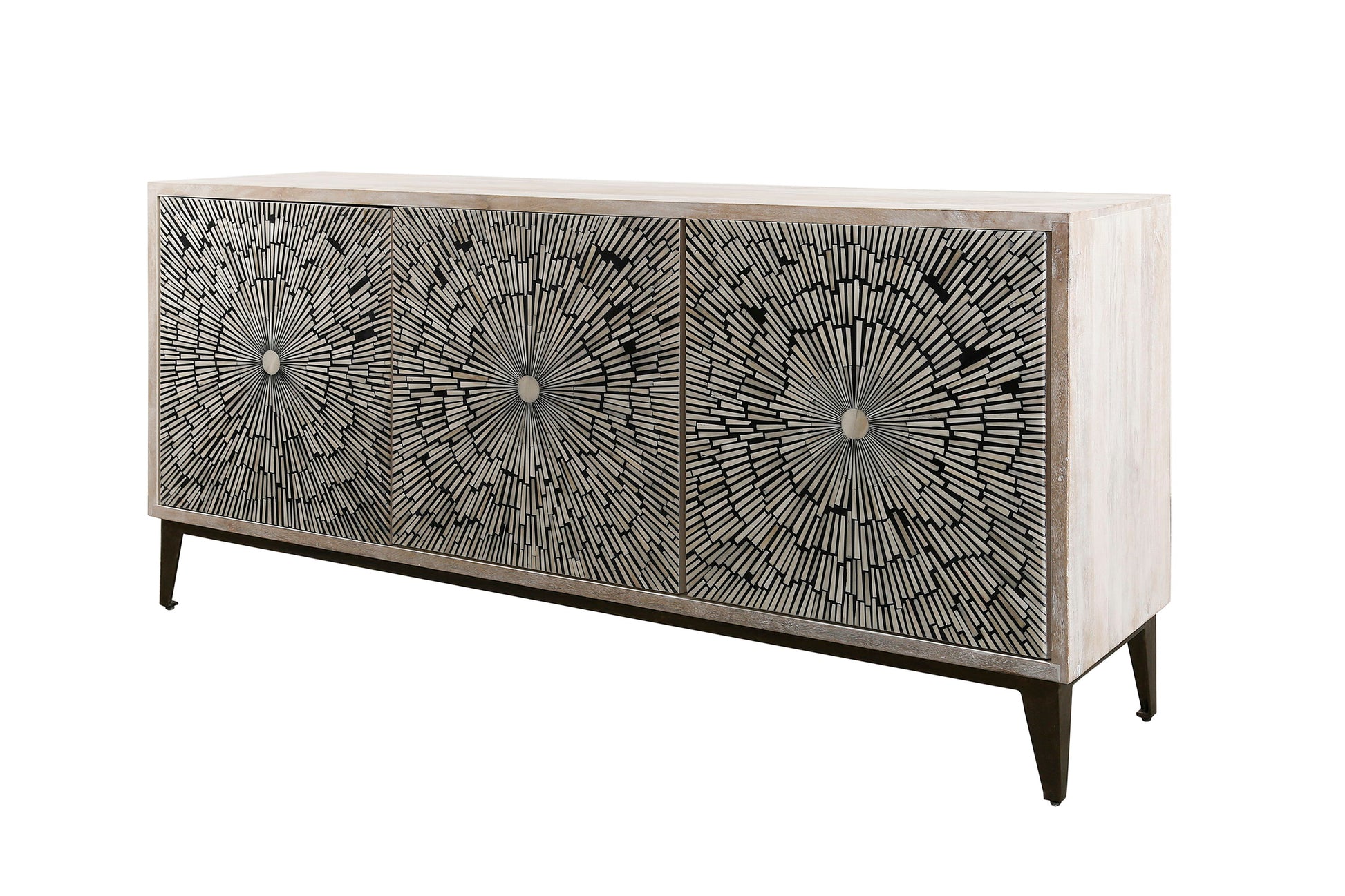 This handcrafted, solid mango and bone inlay console is sure to be the ultimate statement piece for any room in your home. The unique design features an upbeat contemporary organic pattern in black and white, adding a touch of elegance and sophistication to any space. Made with natural variations of color, wood grain, and knots, this console is truly one-of-a-kind. The soft antique white finish over solid mango wood gives it an easygoing character, perfect for any décor style. Each piece is handcrafted by artisans for an authentic, global-inspired character, making it a true work of art. With three touch-latch doors, you'll find ample storage space, with generous compartments and removable interior shelves. The multifunctional console design works as a TV console, buffet, credenza, or in any space you need stylish storage. Each artisanal piece is unique, so colors and patterns vary slightly based on natural materials. The solid iron base adds strength, stability, and style, making this console a durable addition to your home. Add this stunning piece to your living room, dining room, or even your bedroom for an instant upgrade.