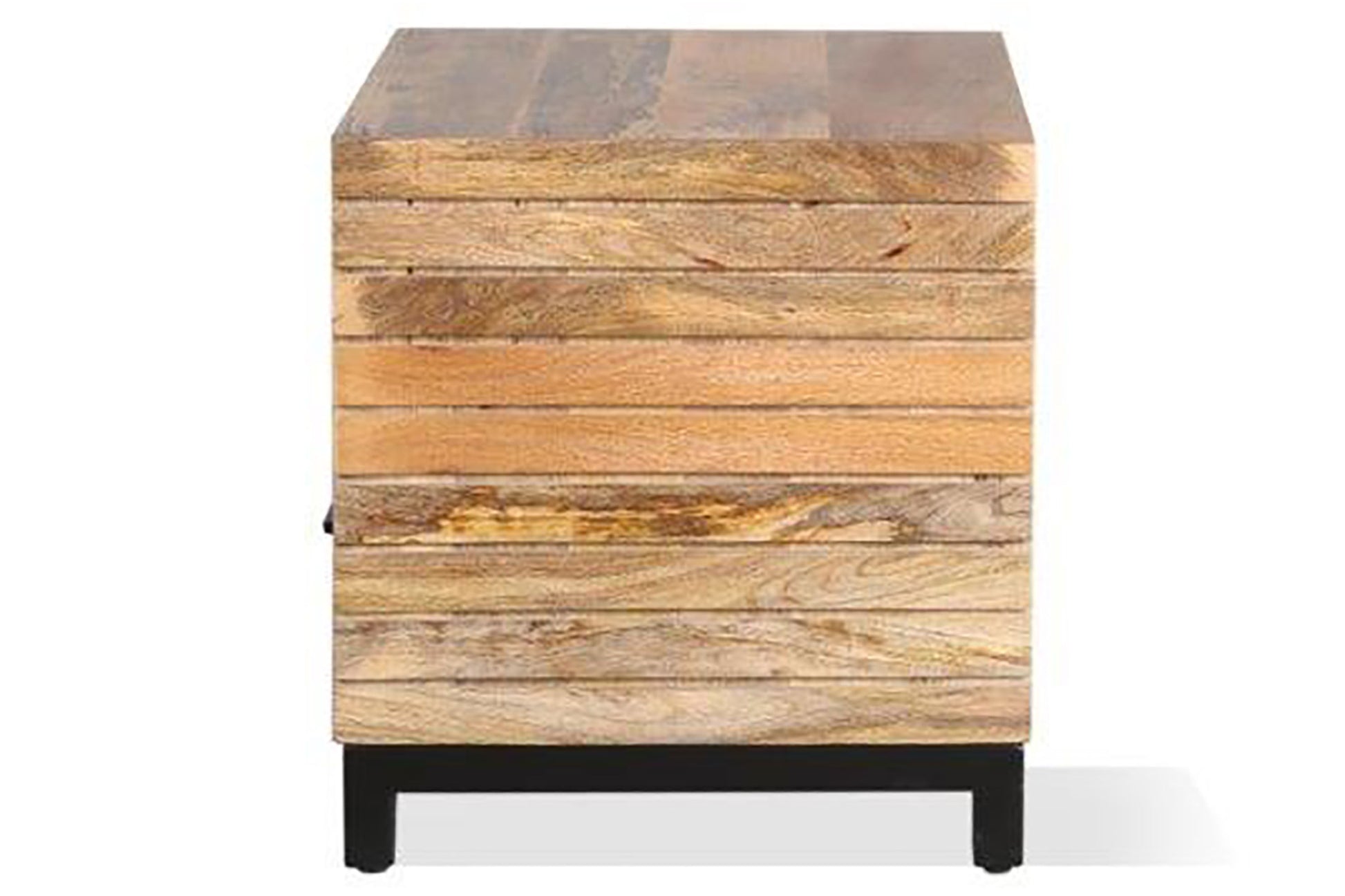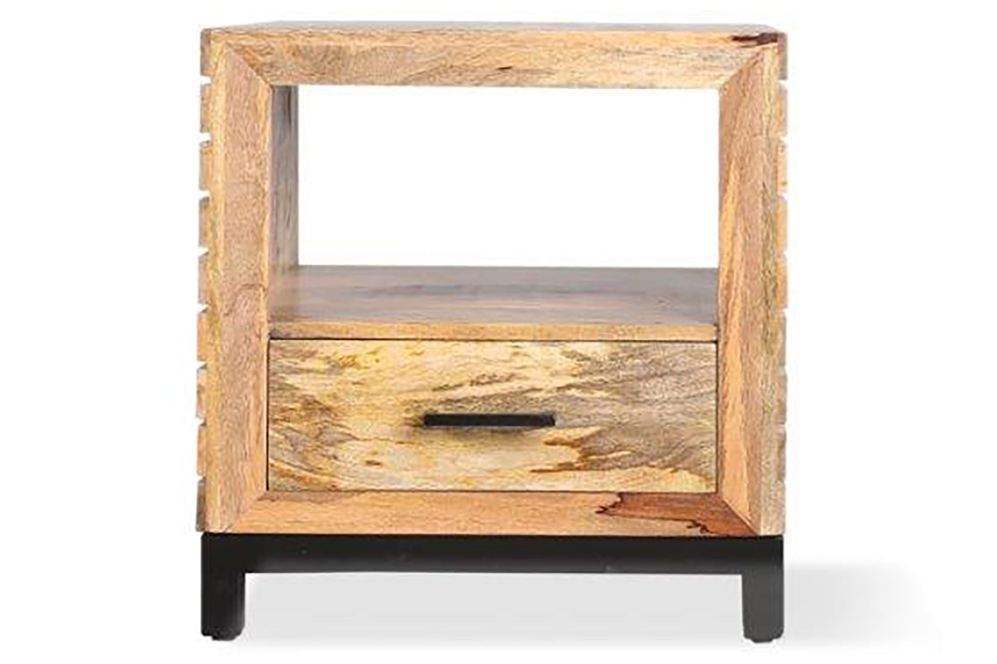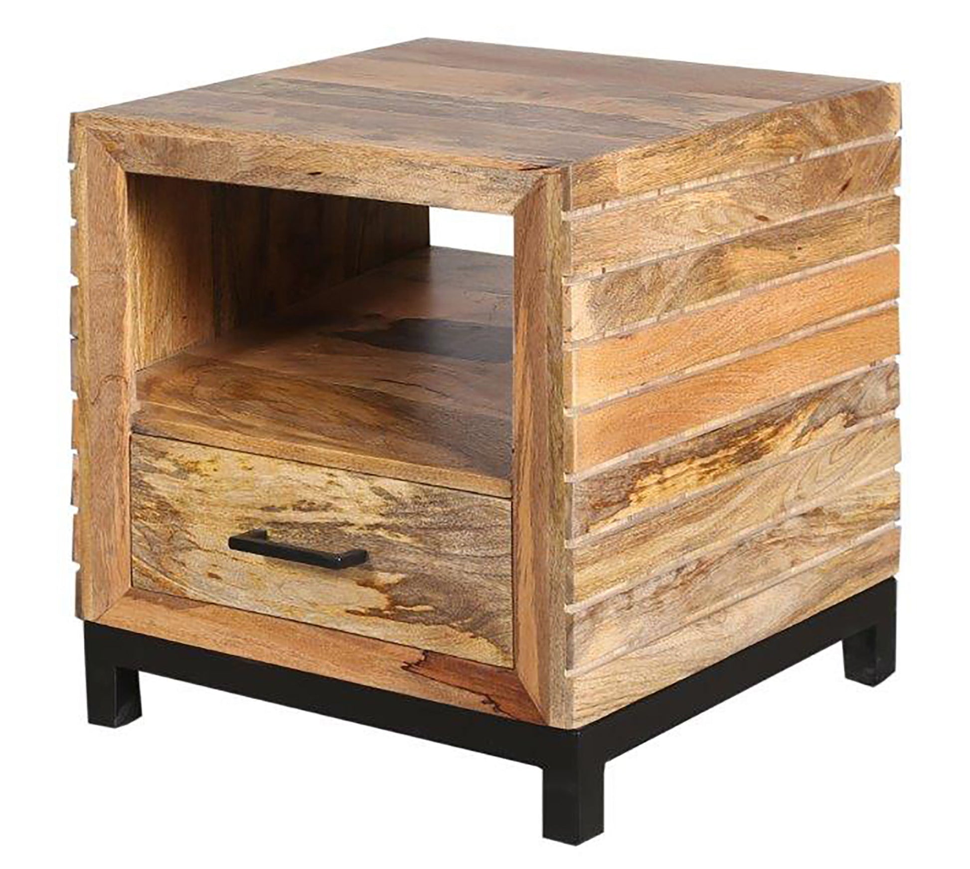 Silhouette of architectural-inspired slatted lines and substantial metal base, this end table gives an organic yet refined fit to any room. Storage drawer and open compartment ensures this intriguing pieces offer both décorative and functional appeal.
