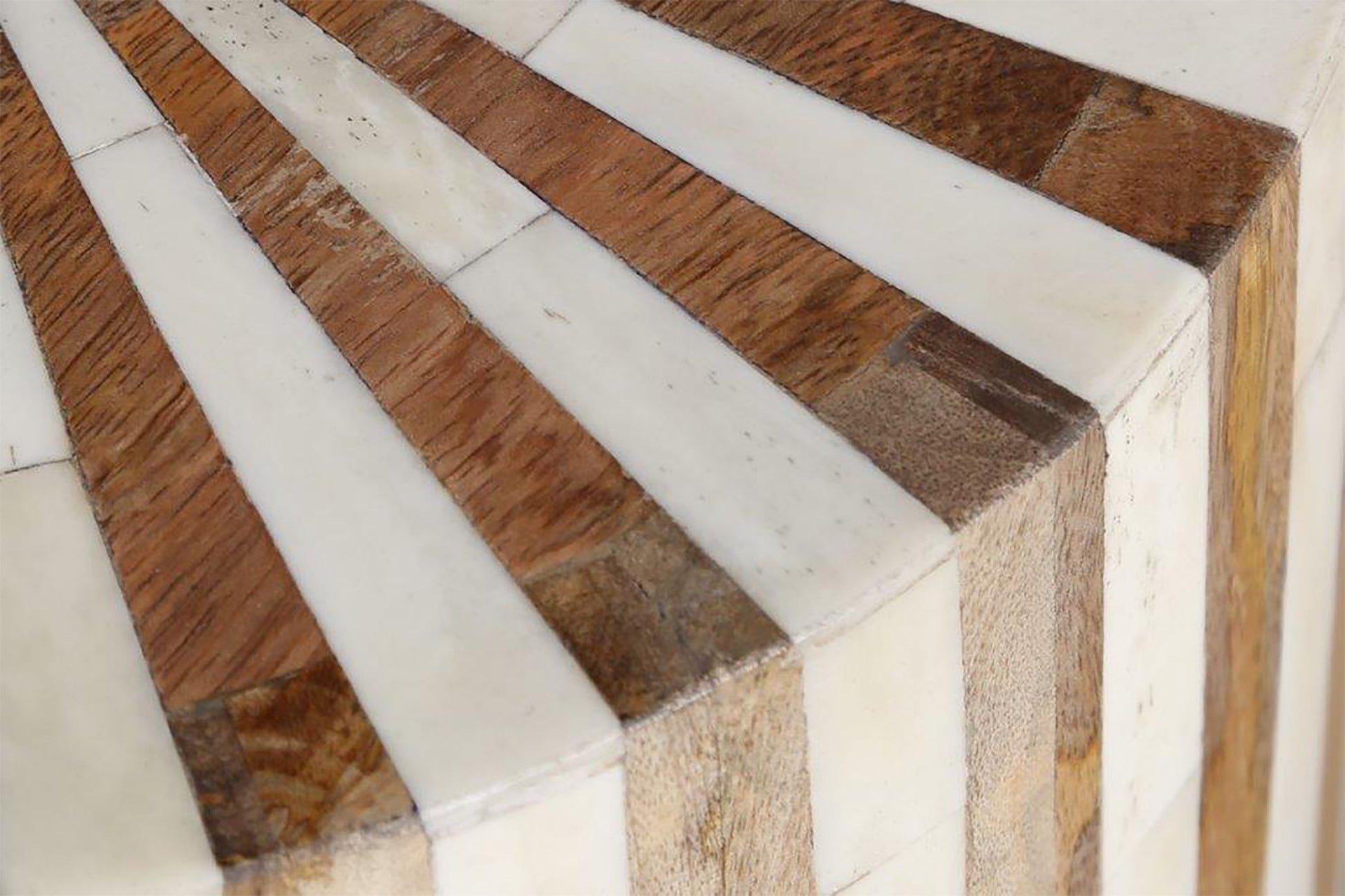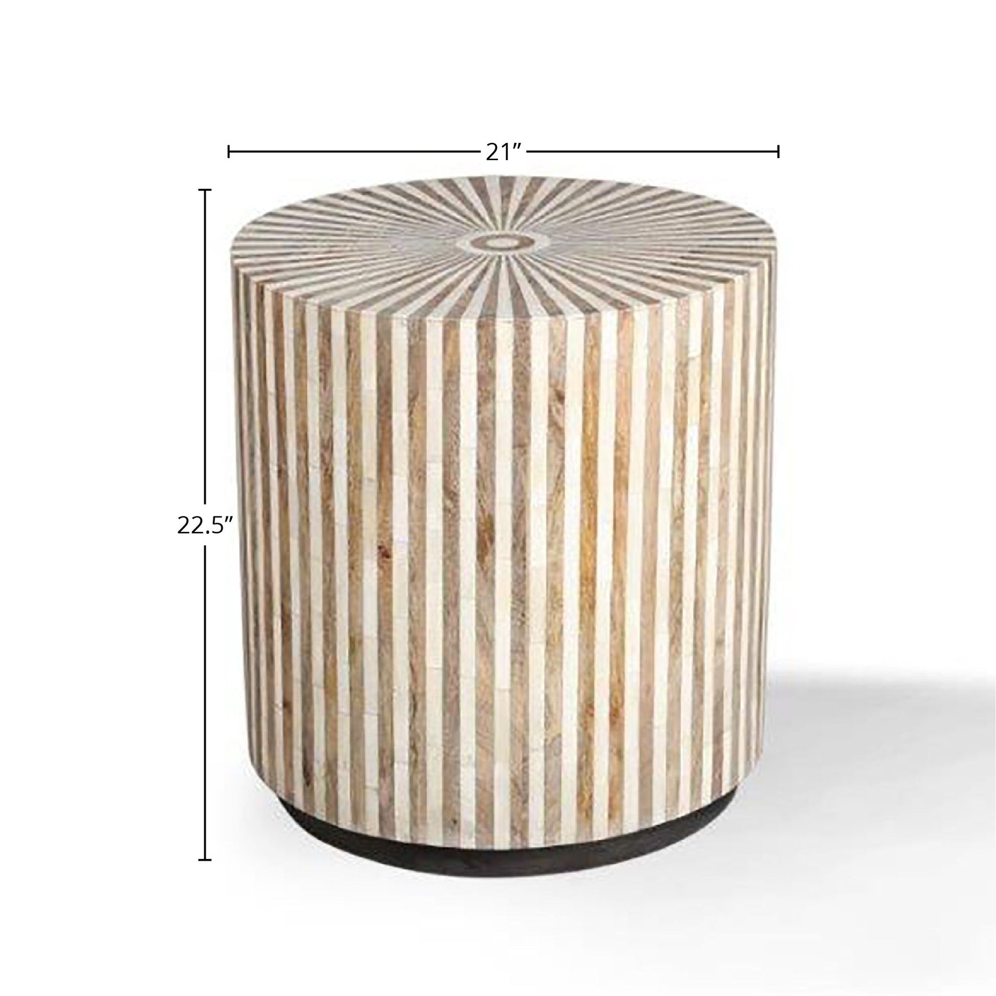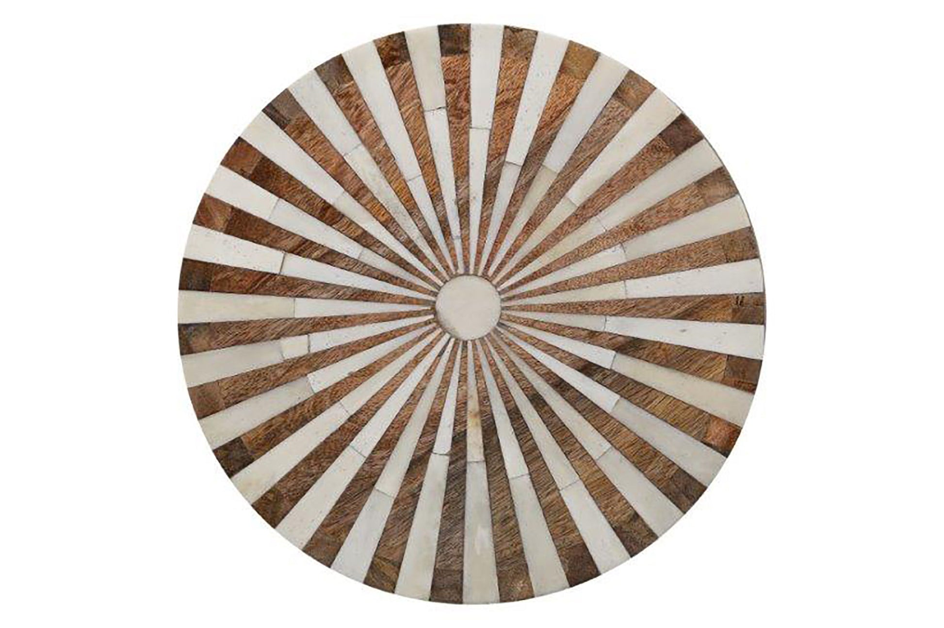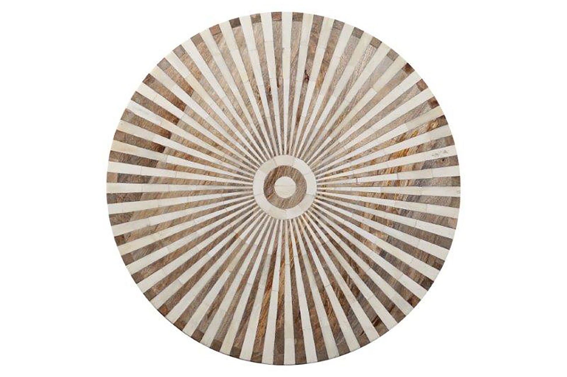 This round accent table offers a youthful, slightly Boho vibe. Organic yet refined this table is made from mango wood and bone inlay in a beautiful radial pattern.