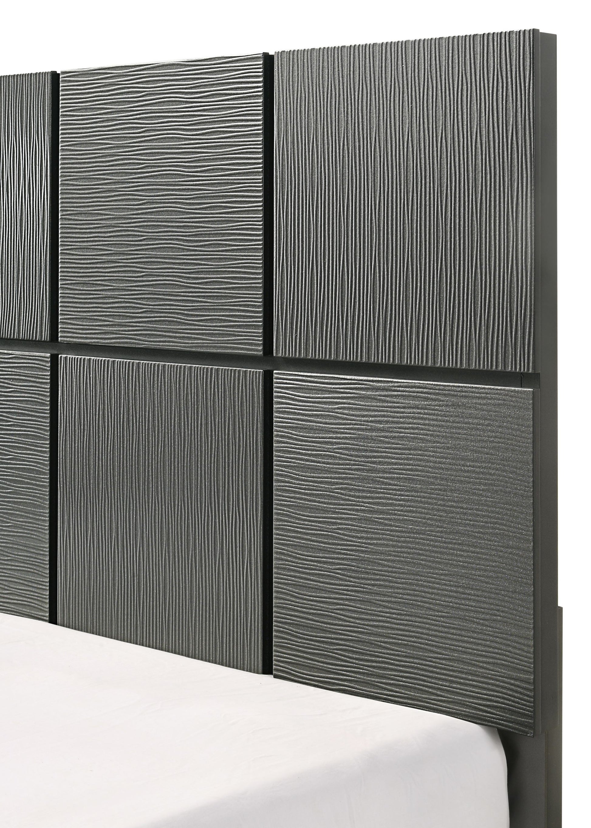 This bedroom collection is the embodiment of sleek, contemporary design, characterized by its rich finish and distinctive textured front panels. The centerpiece, a chic bed with a statement headboard, features geometric paneling that adds depth and interest. Flanked by a matching nightstand and complemented by a spacious dresser with a minimalist mirror, the set offers both style and utility. The clean, linear hardware harmonizes with the set's modern aesthetic, providing a subtle metallic contrast.