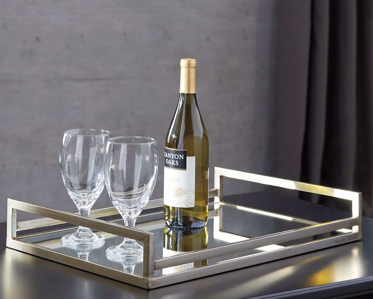 Crafted from metal, the Adria mirrored glass tray features raised railings along the circumference to ensure the safety of your favorite keepsakes. Versatile and visually elevating, this is a great choice for decor spaces with a contemporary feel and design.