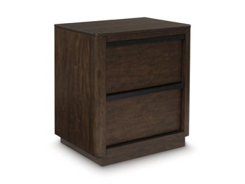 Casual contemporary styling with a decidedly modern vibe. This nightstand is warm and inviting with a rich dark brown finish, adorning your restful retreat with on-trend elegance. Full-length metal pulls in a matte black finish add a subtly cool touch to spacious bedside storage drawers. What a simply stunning way to achieve the bedroom of your dreams.