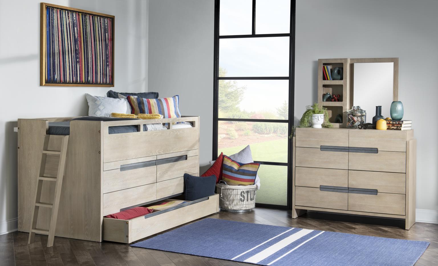 Clean contemporary forms and multi-functional pieces create the energetic District collection by Legacy Kids - Teens. The collection is crafted of Straight Grain White Oak with a Weathered Oak finish and accented by rustic pewter hardware. A focal-point piece is the Captain's Bed combining the functions of sleep study and storage in a compact footprint. Below the elevated bed are 4 drawers and a trundle along with 2 pull-out work surfaces. All sizes of the panel beds have inset headboards and footboards with lighting operated by remote control or an app that can be downloaded allowing children and teens to control lighting colors patterns and intensity and even to program lighting to correspond to the rhythms of the music.