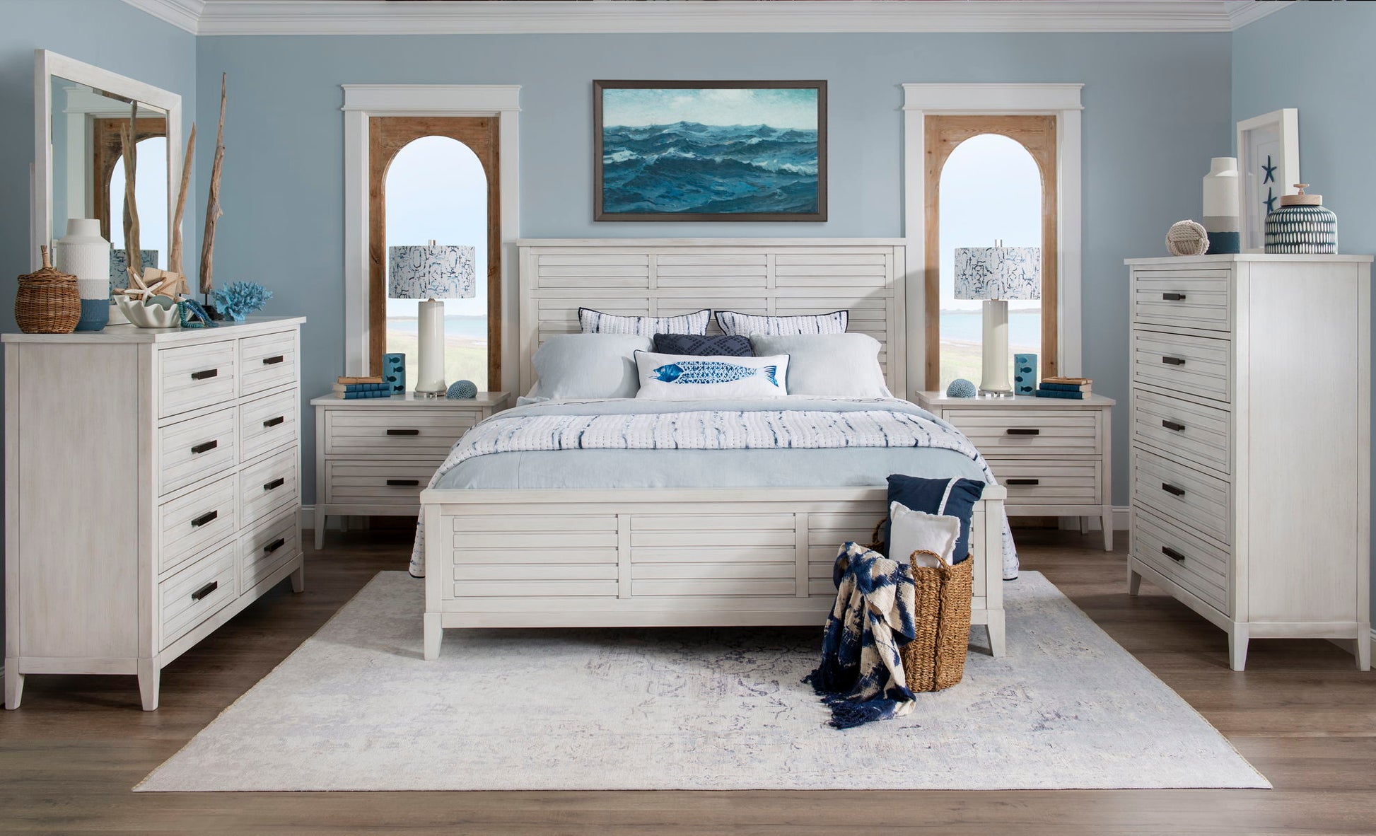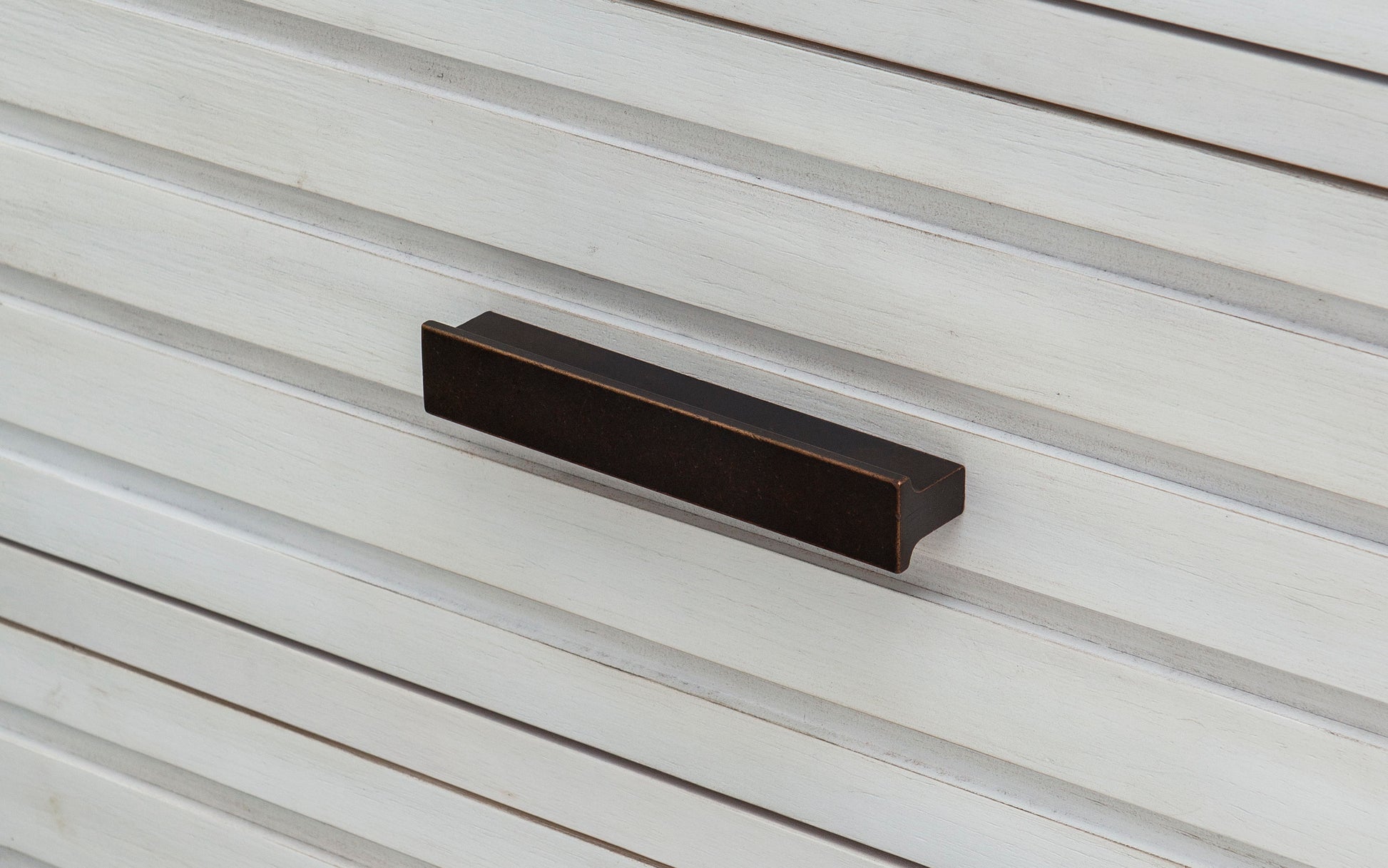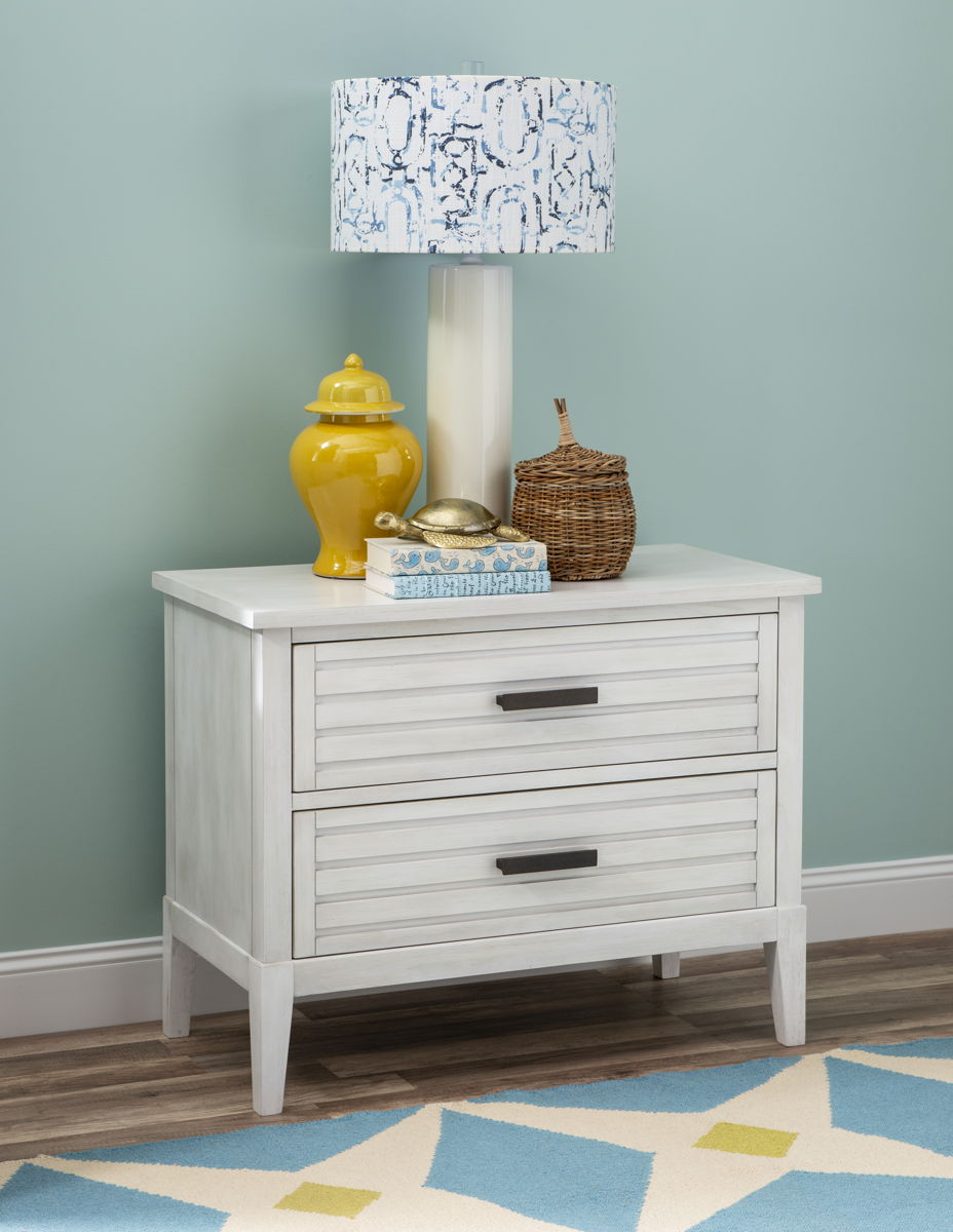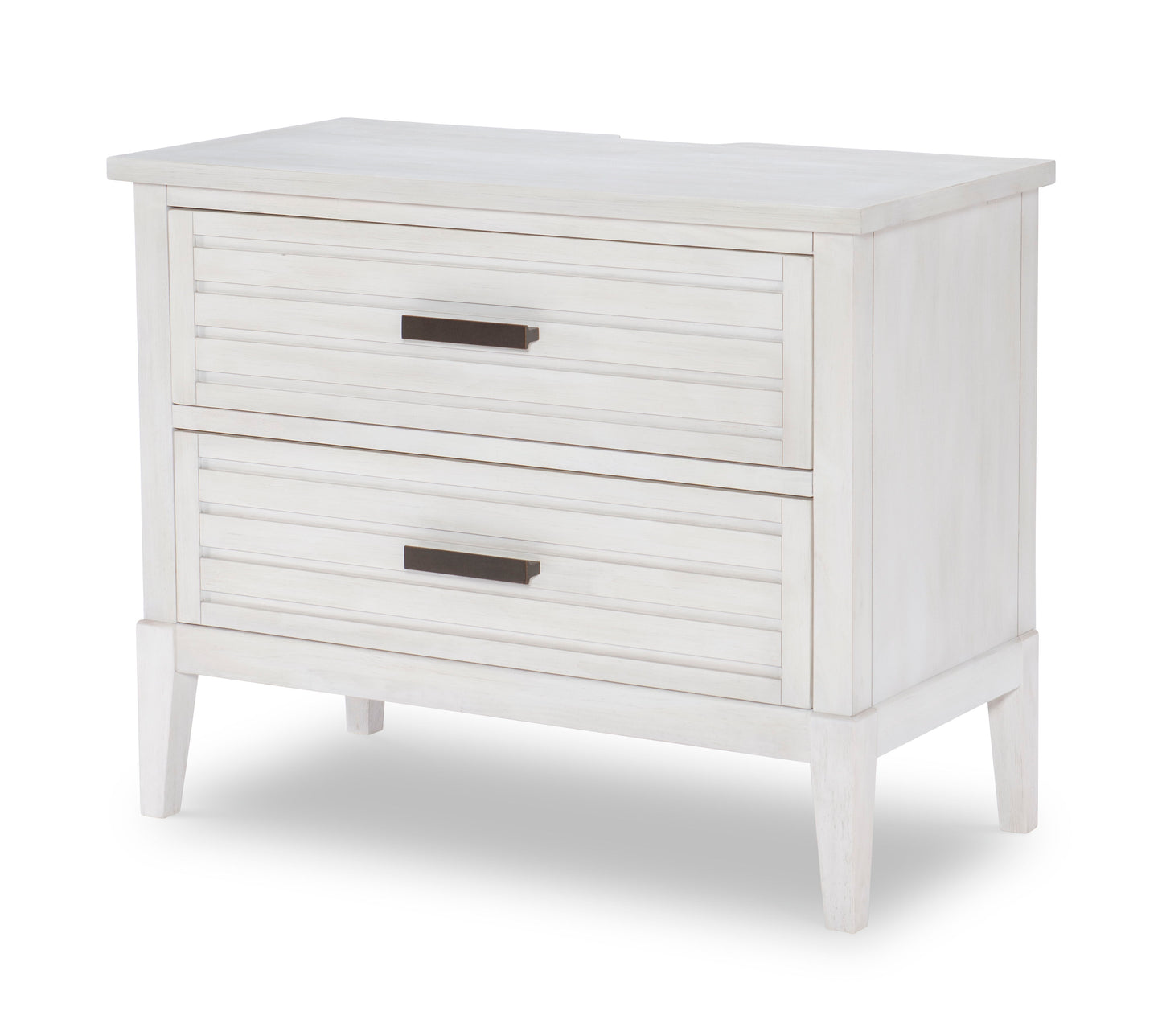 The Edgewater Bachelors Chest Offers Two Drawers, Outlet with USB on Back. Natural tones, classic coastal influences, and a love of casual, come together to create the Edgewater collection. Details such as canted legs, a shutter motif on drawer fronts and bases, along with the Aged Bronze hardware, lend the perfect amount of a relaxed and livable vibe. The Sand Dollar White finish on quartered ash veneer has a slight wire brushing that draws attention to the wood grain and hang up.