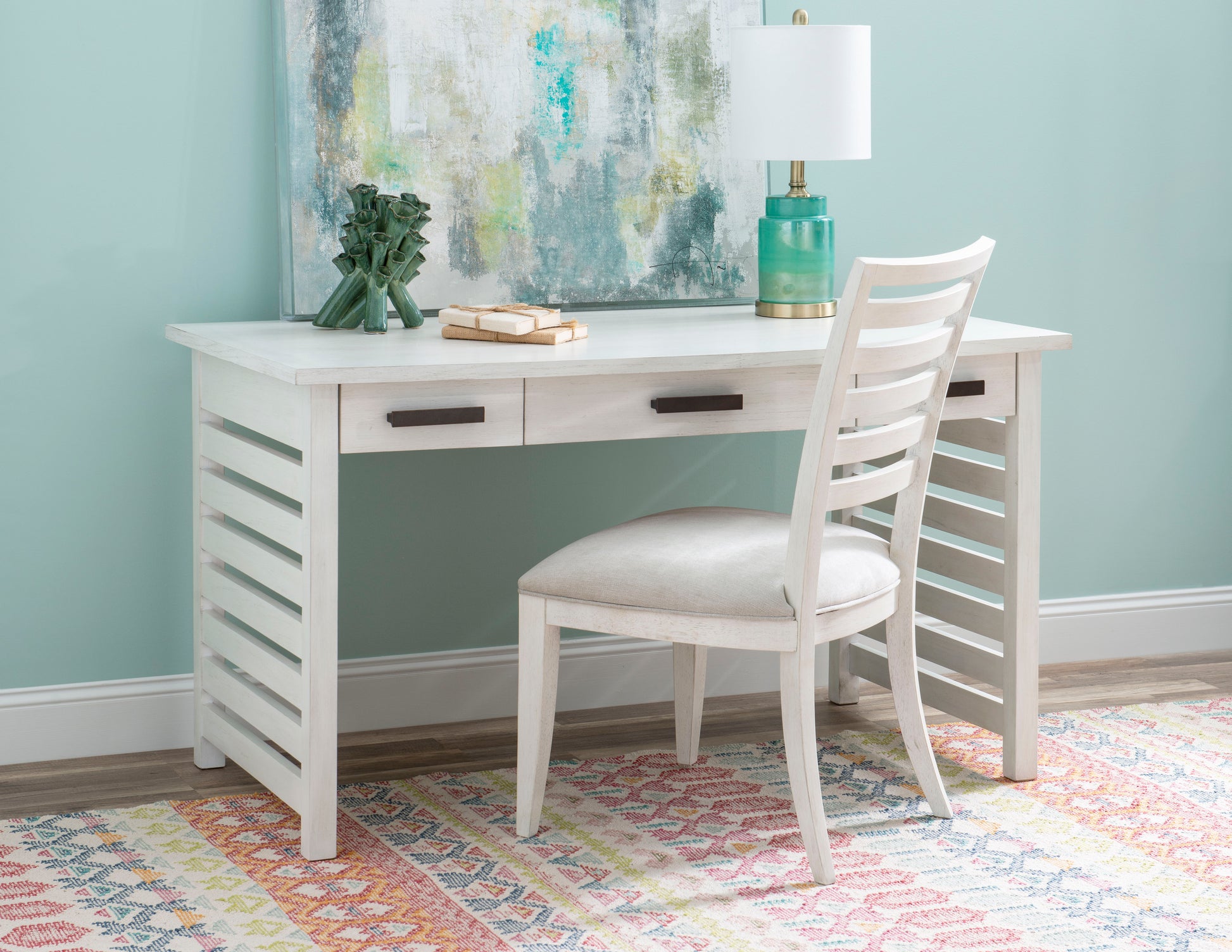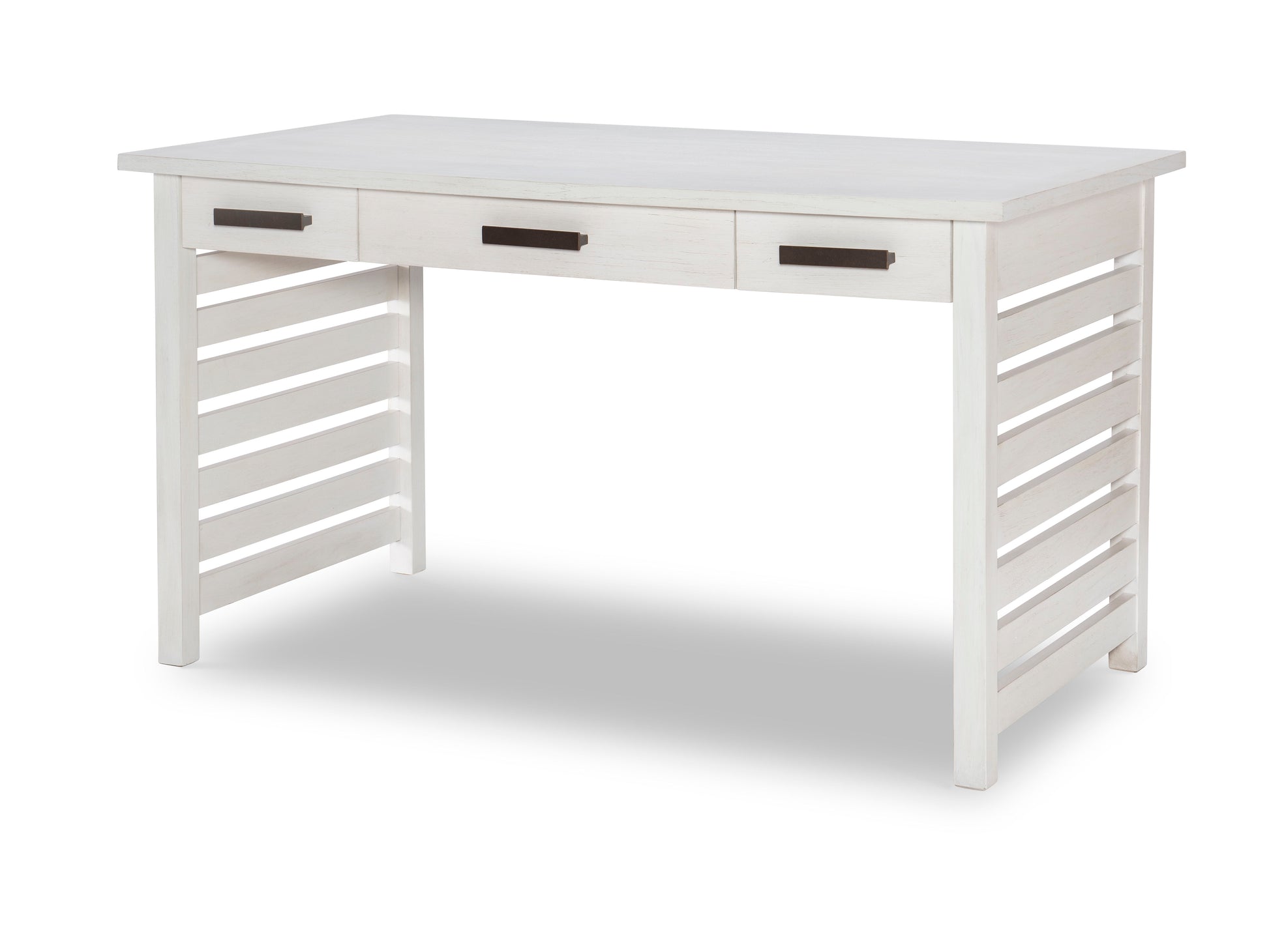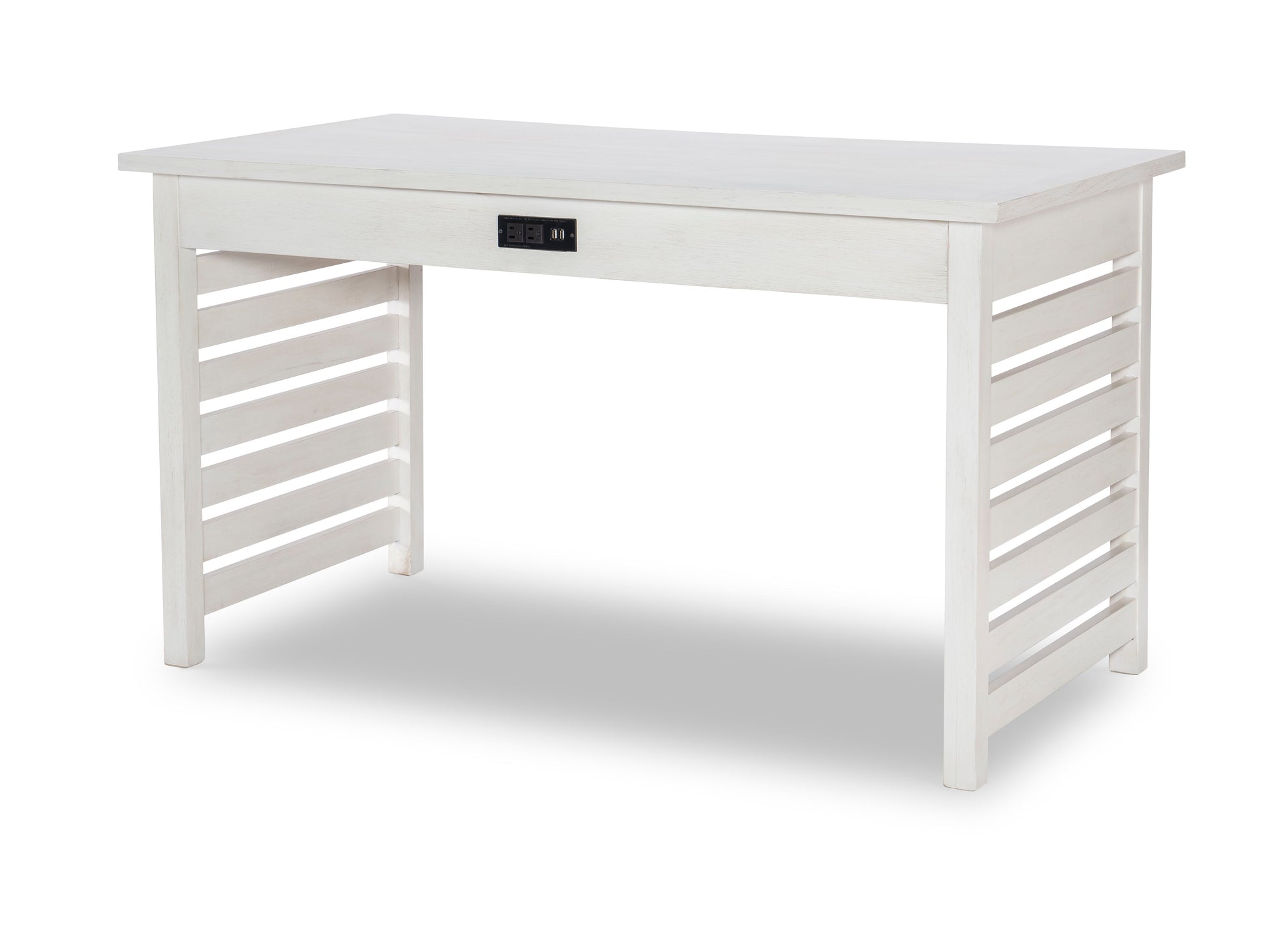The Edgewater Desk offers three drawers, two outlets with two USBs on back. Natural tones, classic coastal influences, and a love of casual, come together to create the Edgewater collection. Details such as canted legs, a shutter motif on drawer fronts and bases, along with the Aged Bronze hardware, lend the perfect amount of a relaxed and livable vibe. The warm Soft Sand finish on quartered ash veneer has a slight wire brushing that draws attention to the wood grain and hang up.