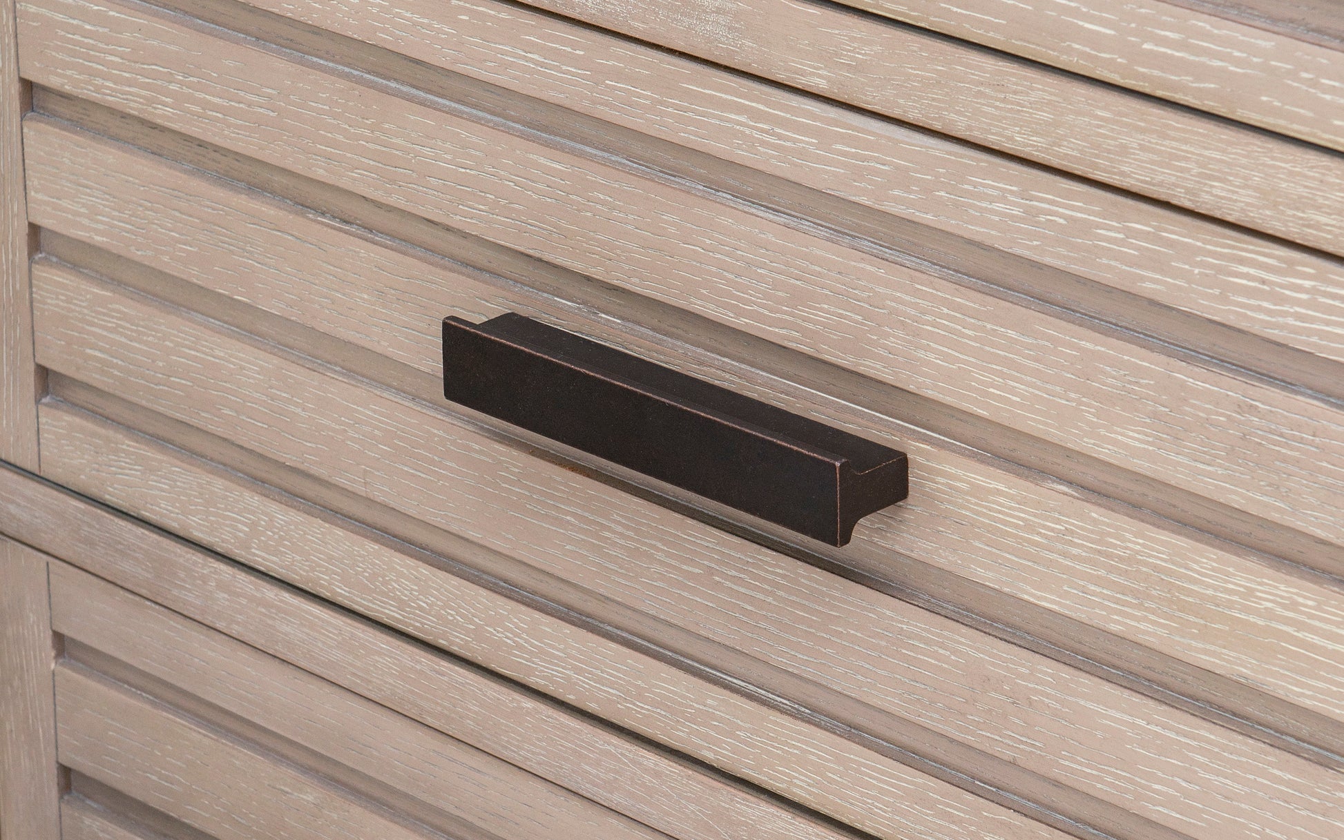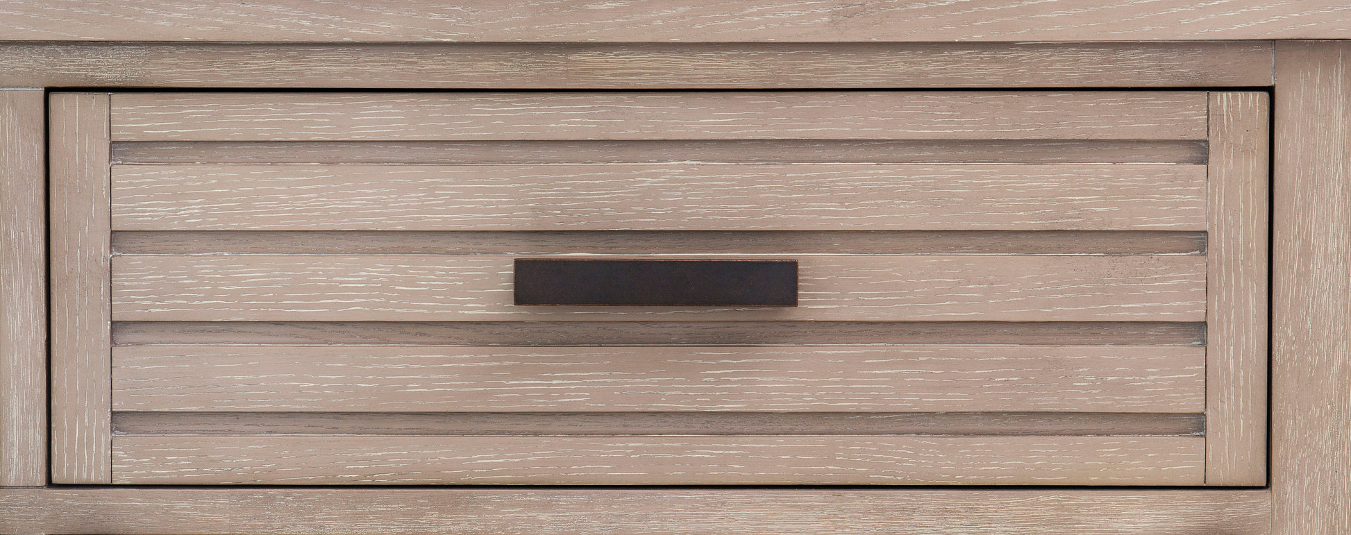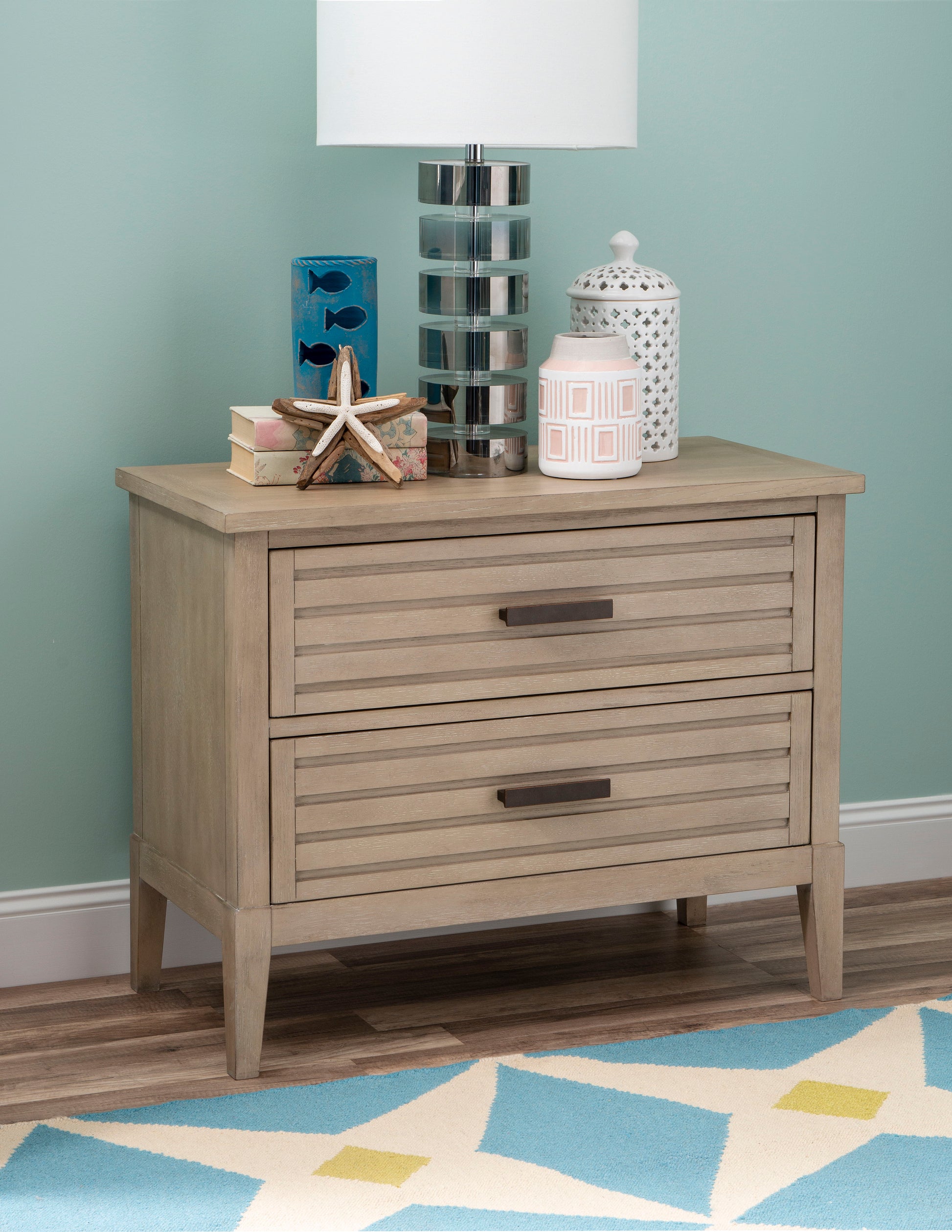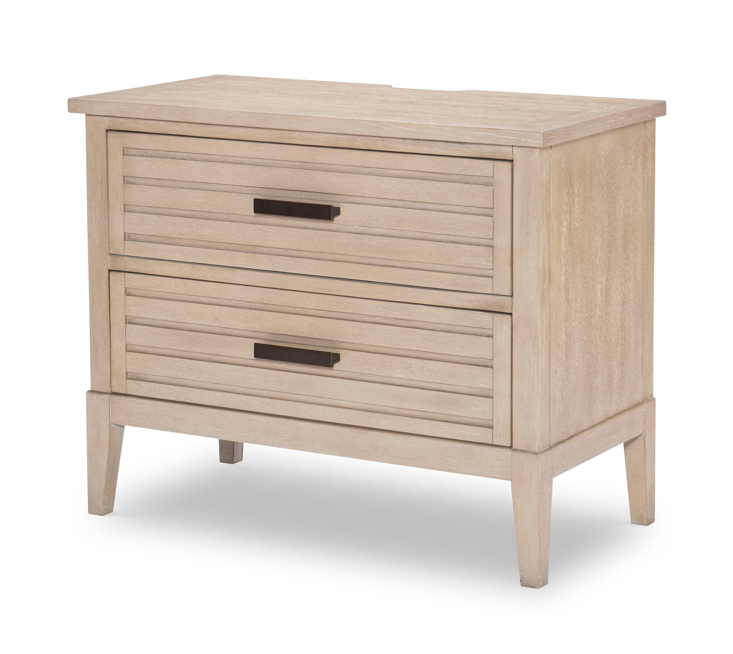The Edgewater Bachelors Chest Offers Two Drawers, Outlet with USB on Back. Natural tones, classic coastal influences, and a love of casual, come together to create the Edgewater collection. Details such as canted legs, a shutter motif on drawer fronts and bases, along with the Aged Bronze hardware, lend the perfect amount of a relaxed and livable vibe. The warm Soft Sand finish on quartered ash veneer has a slight wire brushing that draws attention to the wood grain and hang up.