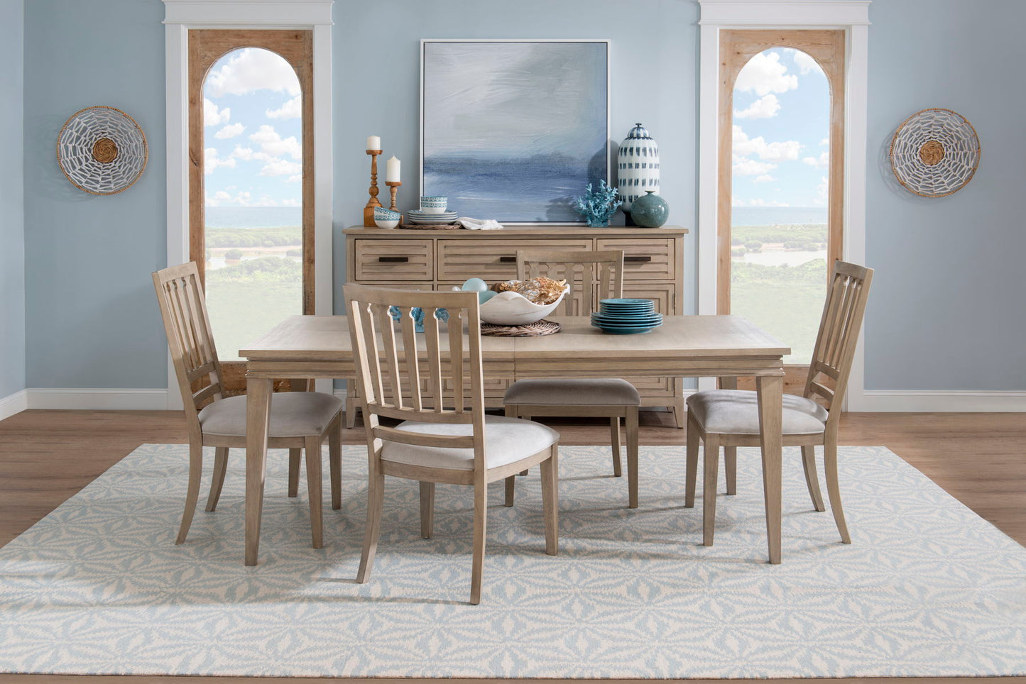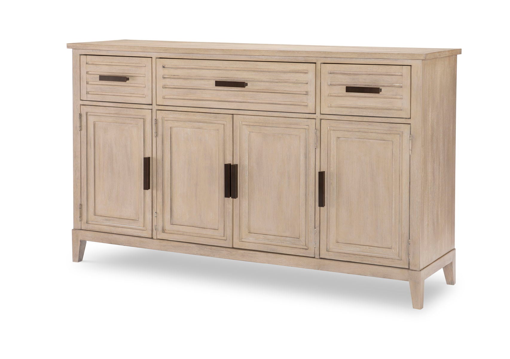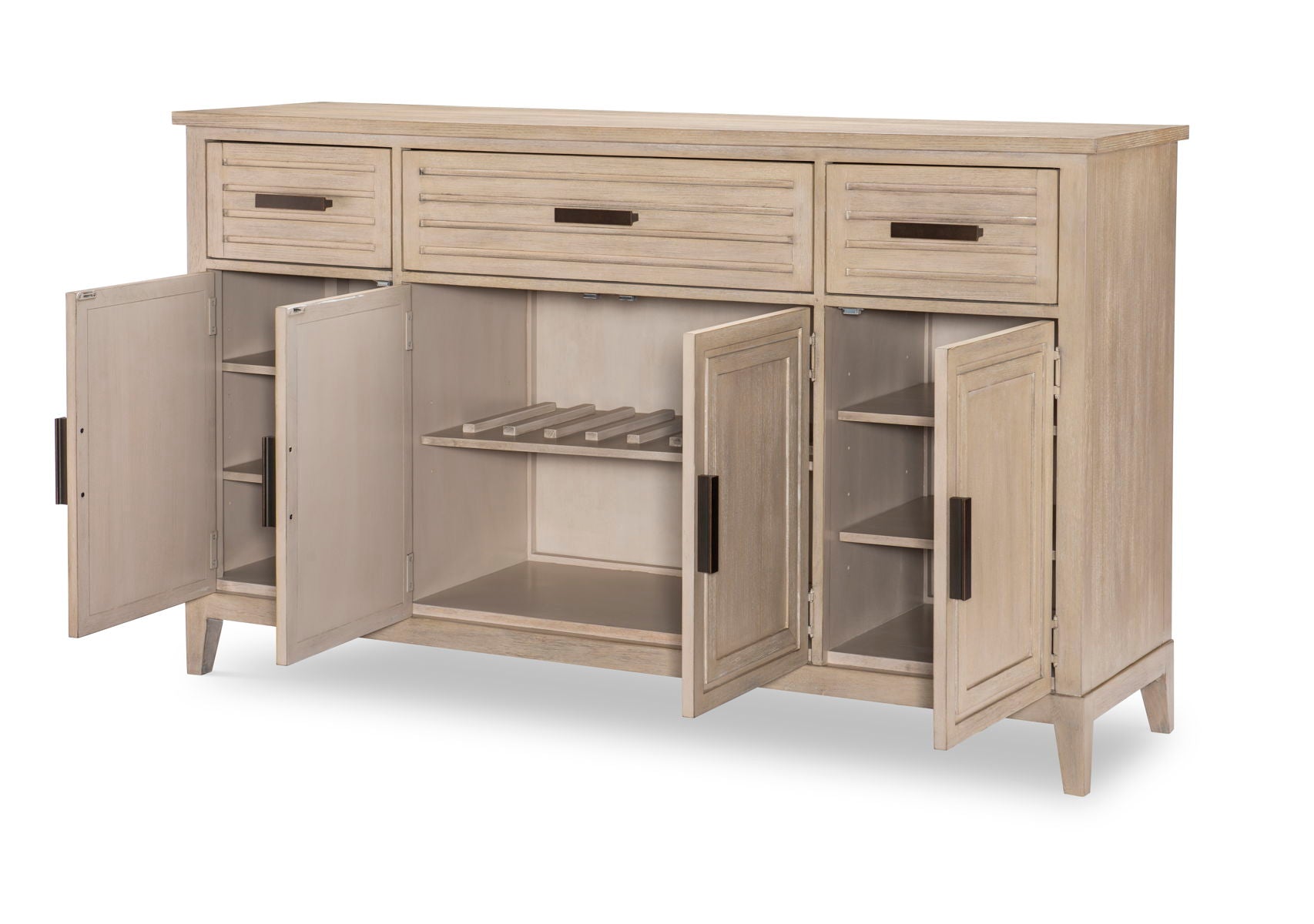 The Edgewater Credenza offers three drawers, center drawer is felt-lined, four doors with two adjustable shelves on RSF & Lsf. Center doors with one adjustable/reversible/removable wine storage shelf. Natural tones, classic coastal influences, and a love of casual, come together to create the Edgewater collection. Details such as canted legs, a shutter motif on drawer fronts and bases, along with the Aged Bronze hardware, lend the perfect amount of a relaxed and livable vibe. The warm Soft Sand finish on quartered ash veneer has a slight wire brushing that draws attention to the wood grain and hang up.