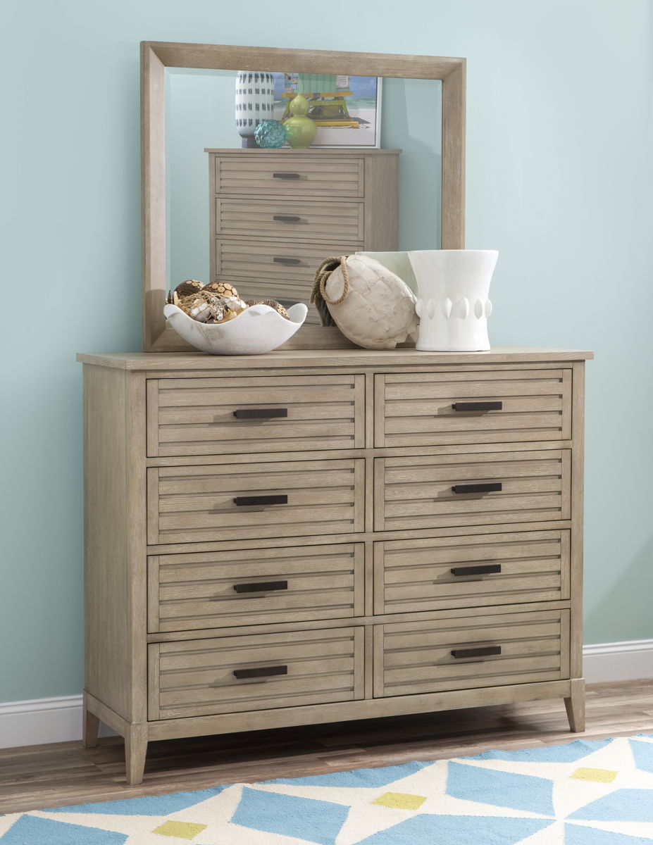 The Edgewater Dresser Offers Eight Drawers, Felt-Lined Top Drawers, RSF Drawer with Jewelry Tray, Cedar-Line Bottom Drawers. Natural tones, classic coastal influences, and a love of casual, come together to create the Edgewater collection. Details such as canted legs, a shutter motif on drawer fronts and bases, along with the Aged Bronze hardware, lend the perfect amount of a relaxed and livable vibe. The warm Soft Sand finish on quartered ash veneer has a slight wire brushing that draws attention to the wood grain and hang up.