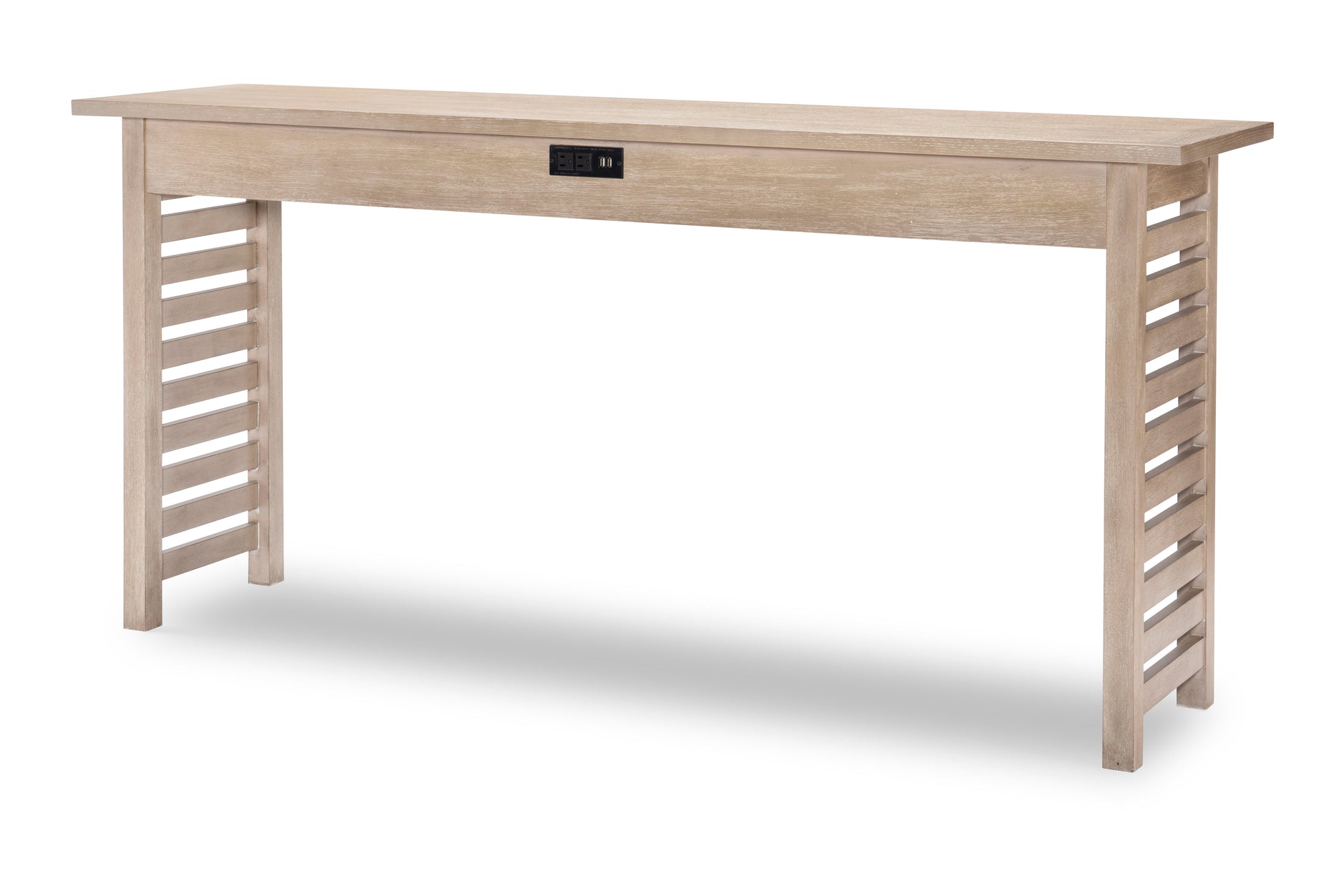 The Edgewater Sofa Table offers two outlets with two USBs on back. Natural tones, classic coastal influences, and a love of casual, come together to create the Edgewater collection. Details such as canted legs, a shutter motif on drawer fronts and bases, along with the Aged Bronze hardware, lend the perfect amount of a relaxed and livable vibe. The warm Soft Sand finish on quartered ash veneer has a slight wire brushing that draws attention to the wood grain and hang up.
