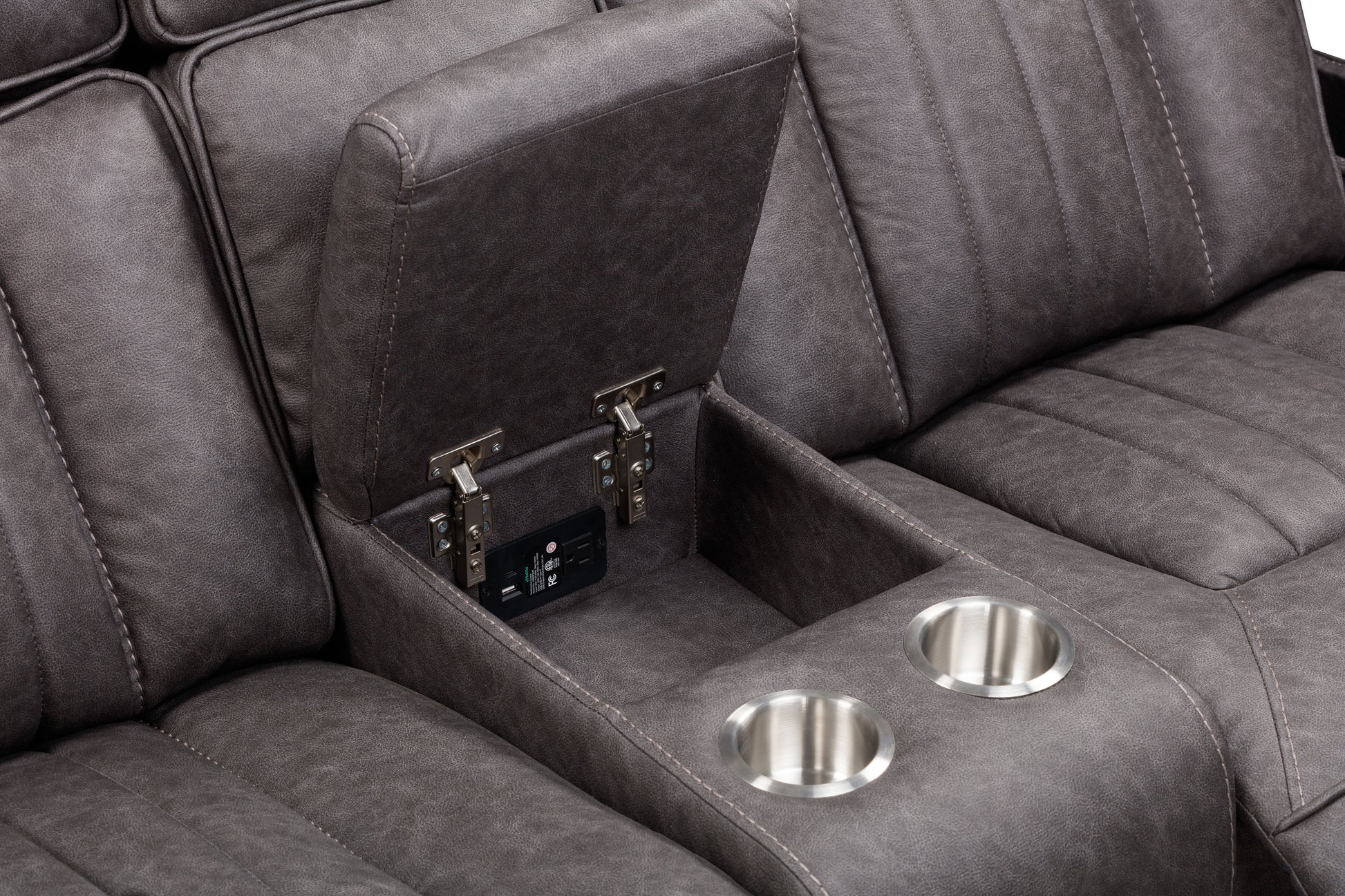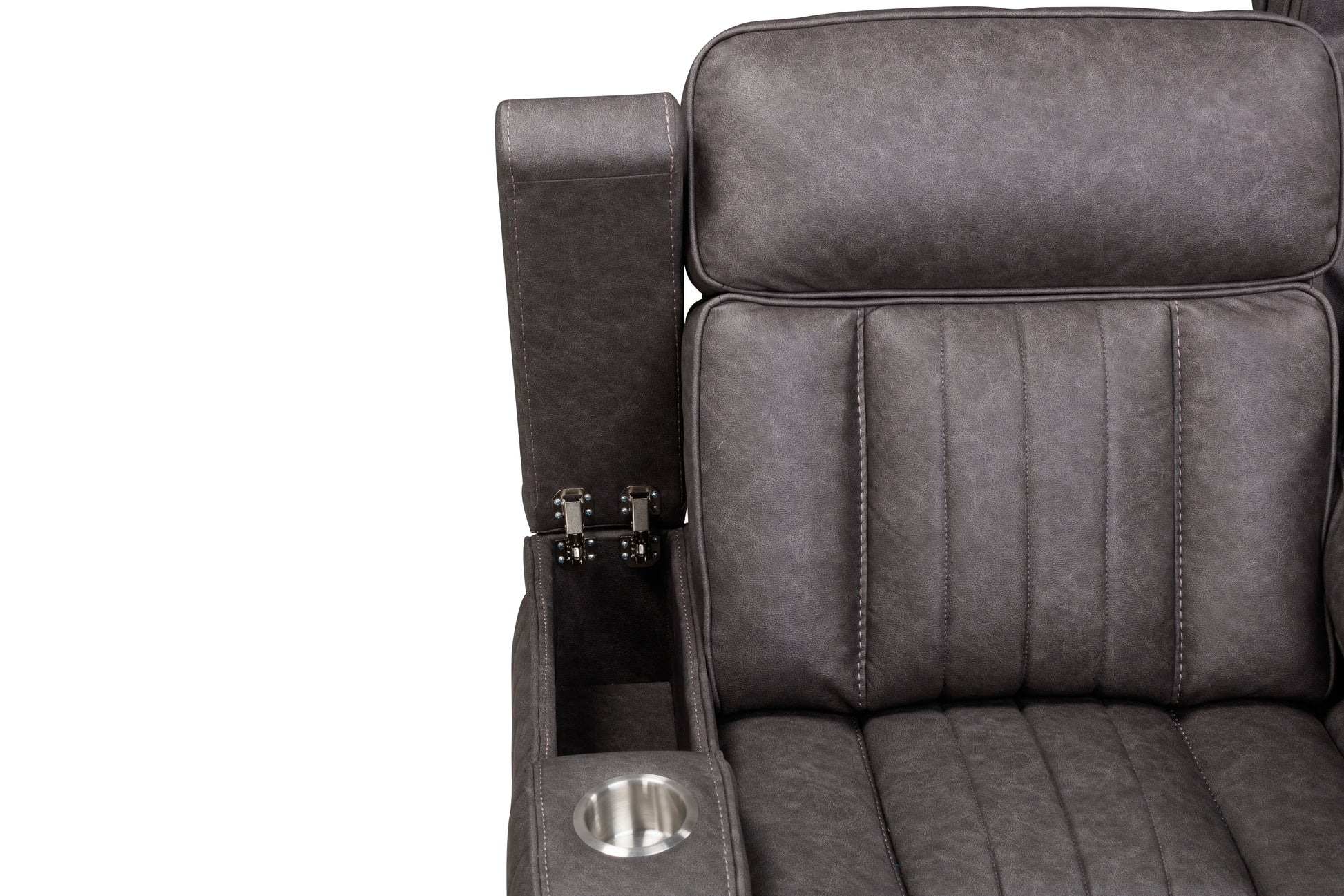 Spice up your movie nights with the Equinox Sofa Group. Consisting of the coordinating Equinox Power Sofa, Power Console Loveseat, and Power Recliner, each power seat also features armrest storage and independently operating power headrests for personalized comfort. Equinox's sofa features an ultra convenient drop-down table in the back of the middle seat, offering cup holders, charging, and overhead lights alongside its always-appreciated table surface space. Cool ambient floor lights at the bases, upholstered channels on the back and leg rests and oversized welt cord ensure that Equinox is the best looking seat in the house!