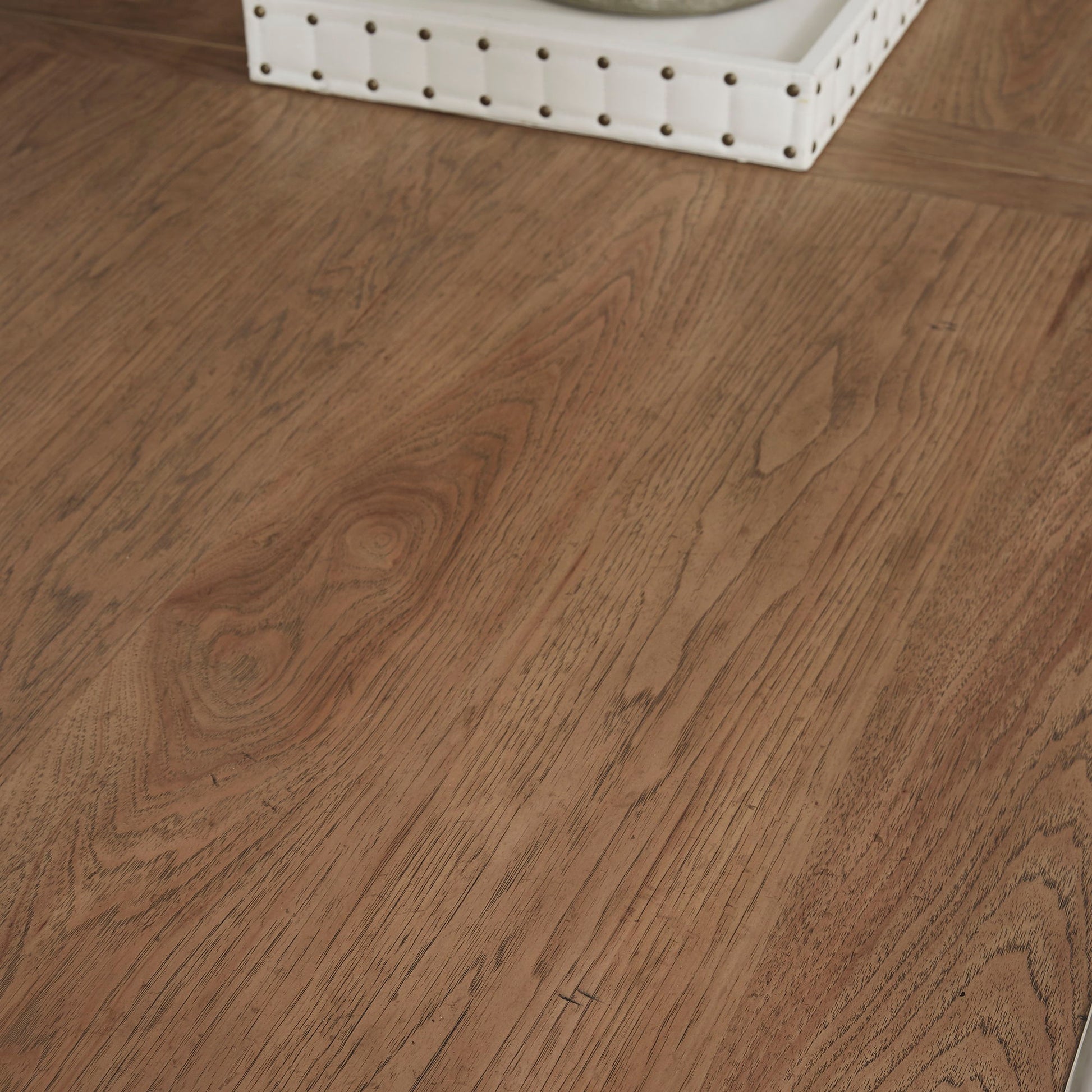 Wow family and friends with the Farmhouse Reimagined trestle table set. Crafted of pine and poplar solids with hickory and pine veneers, this set features an antique white finish with heavy wire brush distressing and a chestnut top and consists of the trestle table and four splat back side chairs. The trestle table features an 18” removable leaf on an easy glide track system for easy opening and is anchored by beautifully curved legs with a center trestle. The splat back side chairs offer beautiful detail on the back and has a padded upholstered seat in a khaki linen fabric with tapered legs and nylon chair glides to protect your flooring. Farmhouse Reimagined offers looks that easily work in today’s homes with style uncompromised and comfort abound.