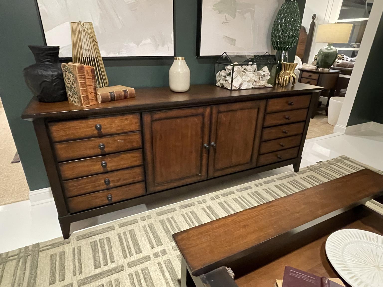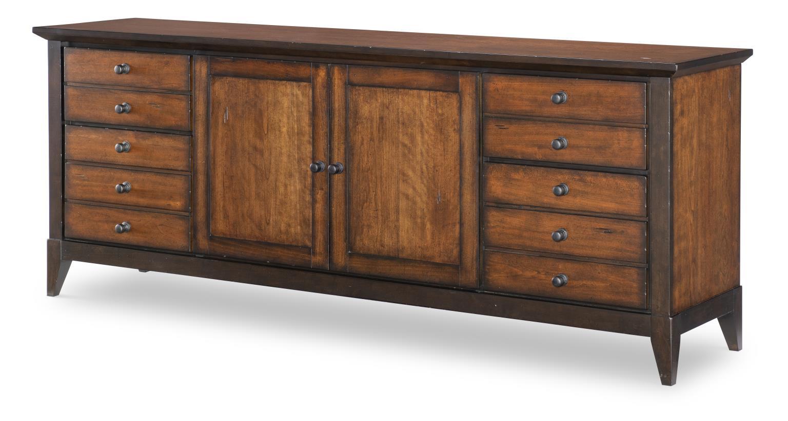 With classic Americana silhouettes and a Shaker influence the Fenmore whole home collection has a striking two-tone finish combining Distressed Cherry on drawer fronts with a Dark Mocha on the body of the cases. A timeless apothecary design is featured on several key pieces in the group such as the dining credenza. Crafted of Cherry on Poplar Hardwood Veneers the collection is accented by texturized forged iron hardware.