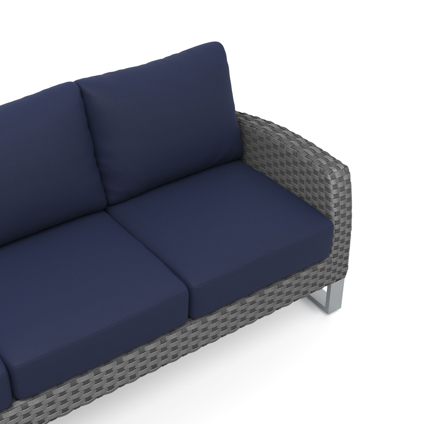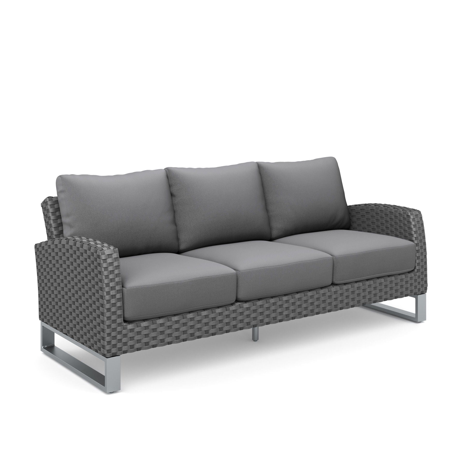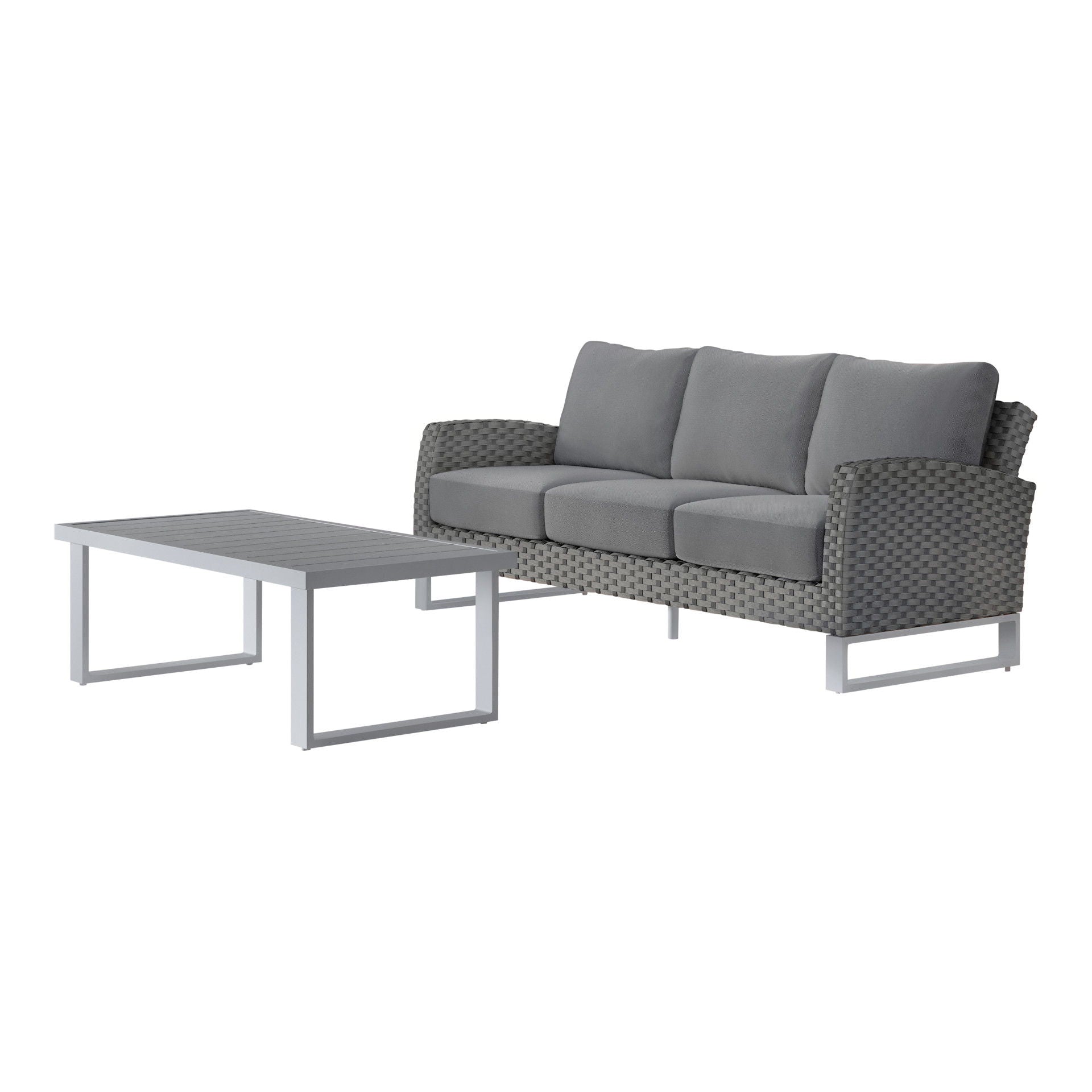 Revitalize your outdoor space with the Fiji Set. Built to last, the aluminum frames with a powder finish provide a sturdy foundation for your patio set, enhancing its scratch resistance and offering a breezy finish. Crafted for all-weather durability, the high density HDPE Wicker mimics the look of traditional wicker while being low maintenance and resistant to water, mildew, and fading. Sink into comfort with supportive seat cushions crafted from high density foam and upholstered in our exclusive SUNDURA® Olefin fabrics, ensuring year-round freshness. The sweeping back, thick armrests, and gentle curves of the sofa evoke a relaxing, contemporary vibe, perfect for any outdoor entertainment area. Complete with a durable coffee table featuring a powder-coated aluminum gray slat top, this set offers both style and convenience for your outdoor gatherings.