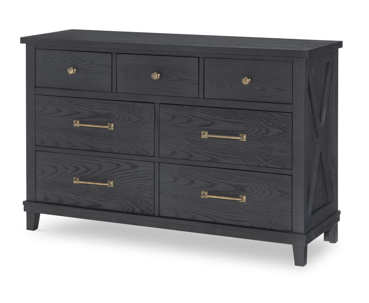Rustic comfortable yet modern. Clean lines combine with natural textures and dark tones to create the Flatiron youth collection. Modern farmhouse designs such as block feet flat drawer fronts and X motifs on side panels offer a lot of details without feeling cluttered. The natural variations of the grain and rich Midnight finish offer a casual livable style. Simple Antique Brass finished bar pull and knob hardware completes each piece.