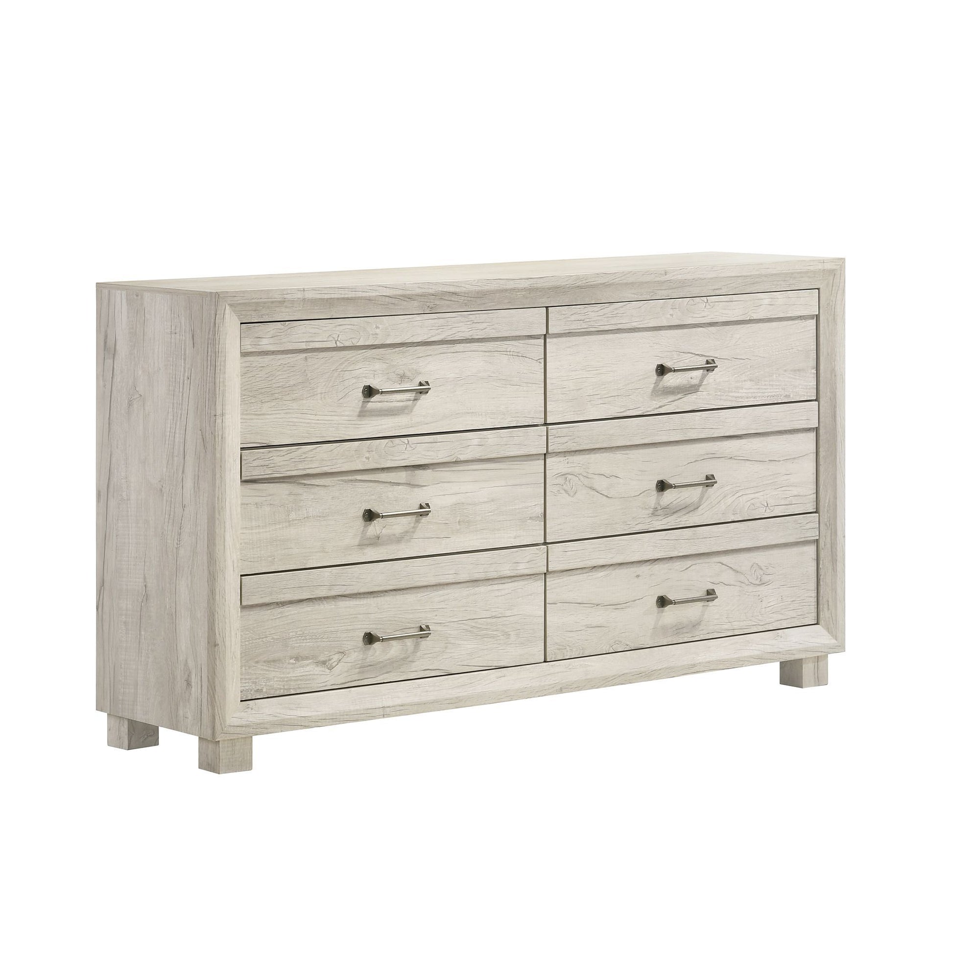 The Fort Worth 6-Drawer Dresser features angled, solid wood framing, giving it a unique and rustic look. The grove detail on the drawer fronts and industrial metal pulls add elegance to the overall design. Crafted with 3D wood grain PU paper veneer, this dresser has a realistic wood texture that adds depth to its crisp, white finish. Its unique, block feet provide fashionable stability and durability while the felt-lined top drawers ensures that your delicate items are well protected. Whether you're looking for extra storage or adding character to your bedroom, the Fort Worth 6-Drawer Dresser is the perfect choice.