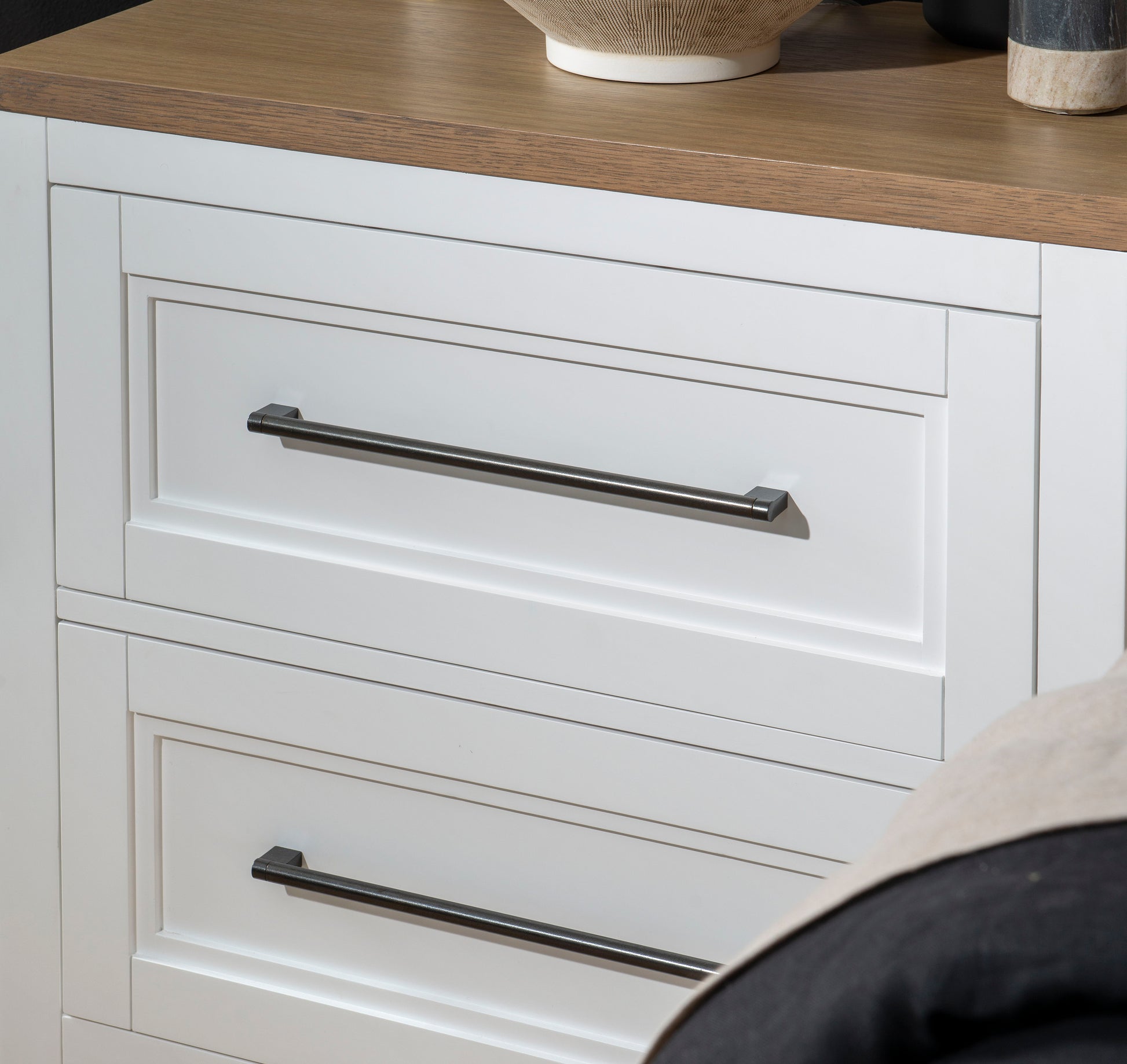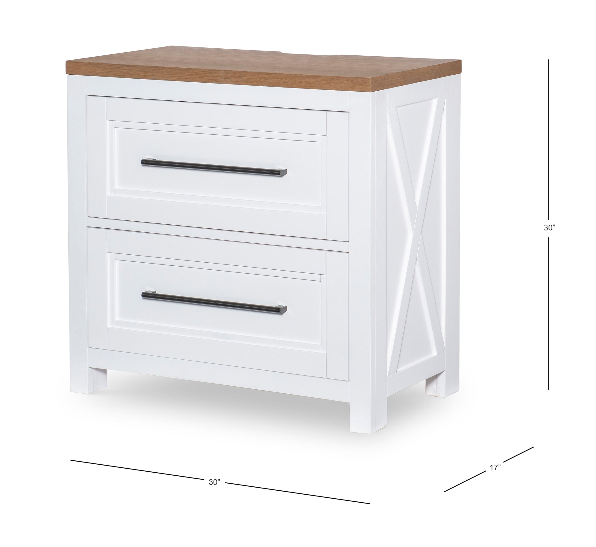 Tactile, yet refined, and always modern. Clean lines meld with comfortable textures and tones in our total home collection, Franklin. Simple farmhouse details such as block feet, beveled framed drawer fronts, planking and X motifs create visual interest in a modern way and without feeling too cluttered. Harvest Oak tops on quartered white oak veneer sit atop Natural White painted bases. Select items offered in Aged Black that repeats the finish on hardware and accents.