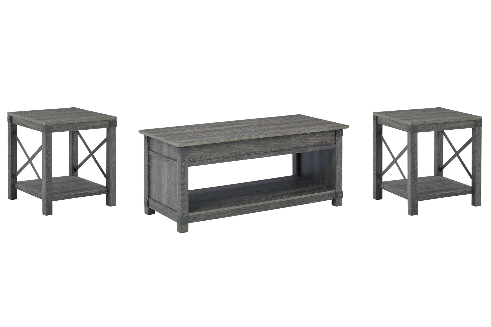 Raise the bar on modern farmhouse design with this accent table set. Sporting a grayish brown replicated wood grain effect, the coffee table's handy spring-loaded mechanism brings the tabletop closer to you. This versatile table makes it easier than ever to eat, work or play from the comfort of your sofa. A pair of coordinating end tables completes the set in style.
