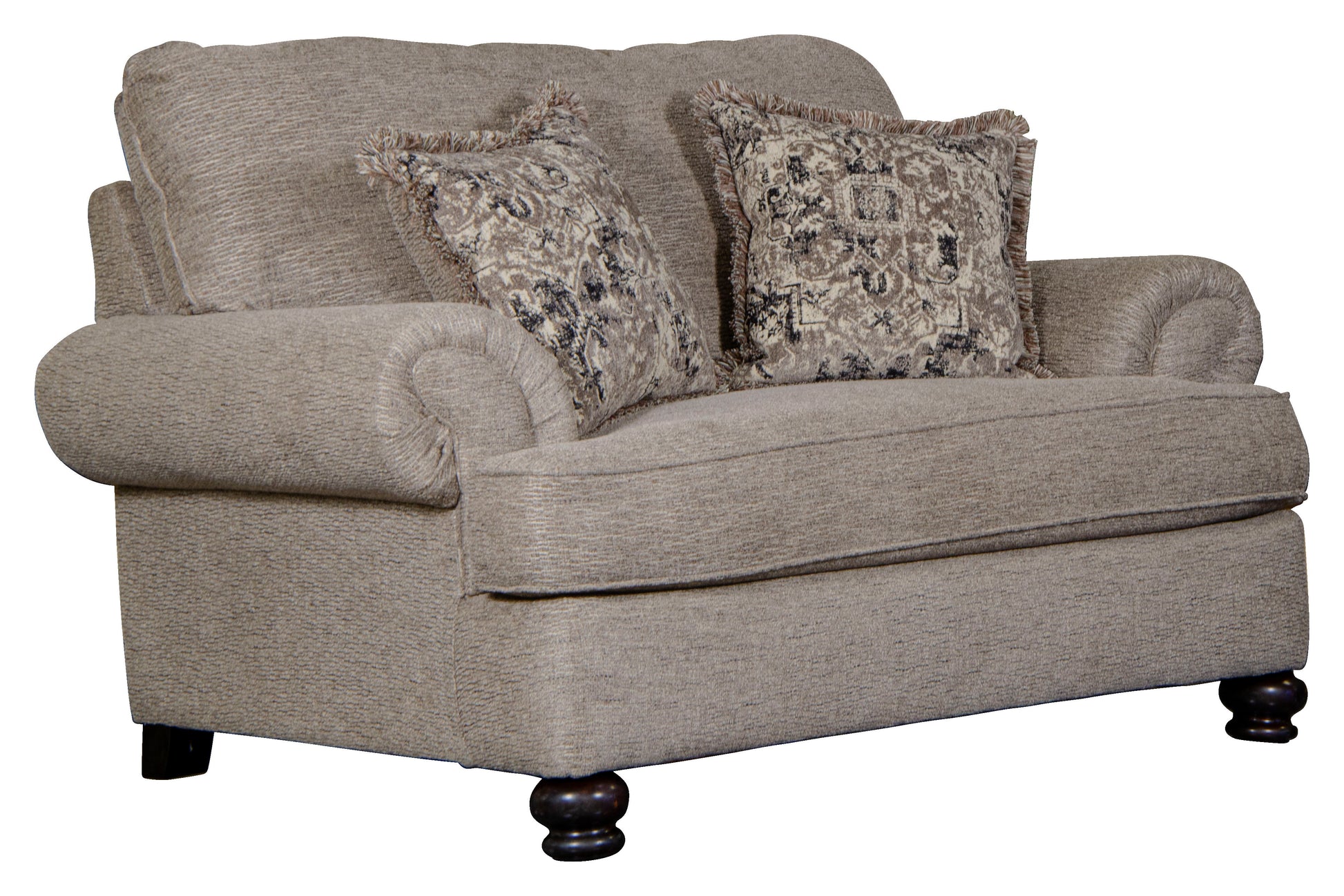 The Freemont collection is big and deep featuring traditional rolled arm design with wooden legs and correlating toss pillows in decorative fringe.
