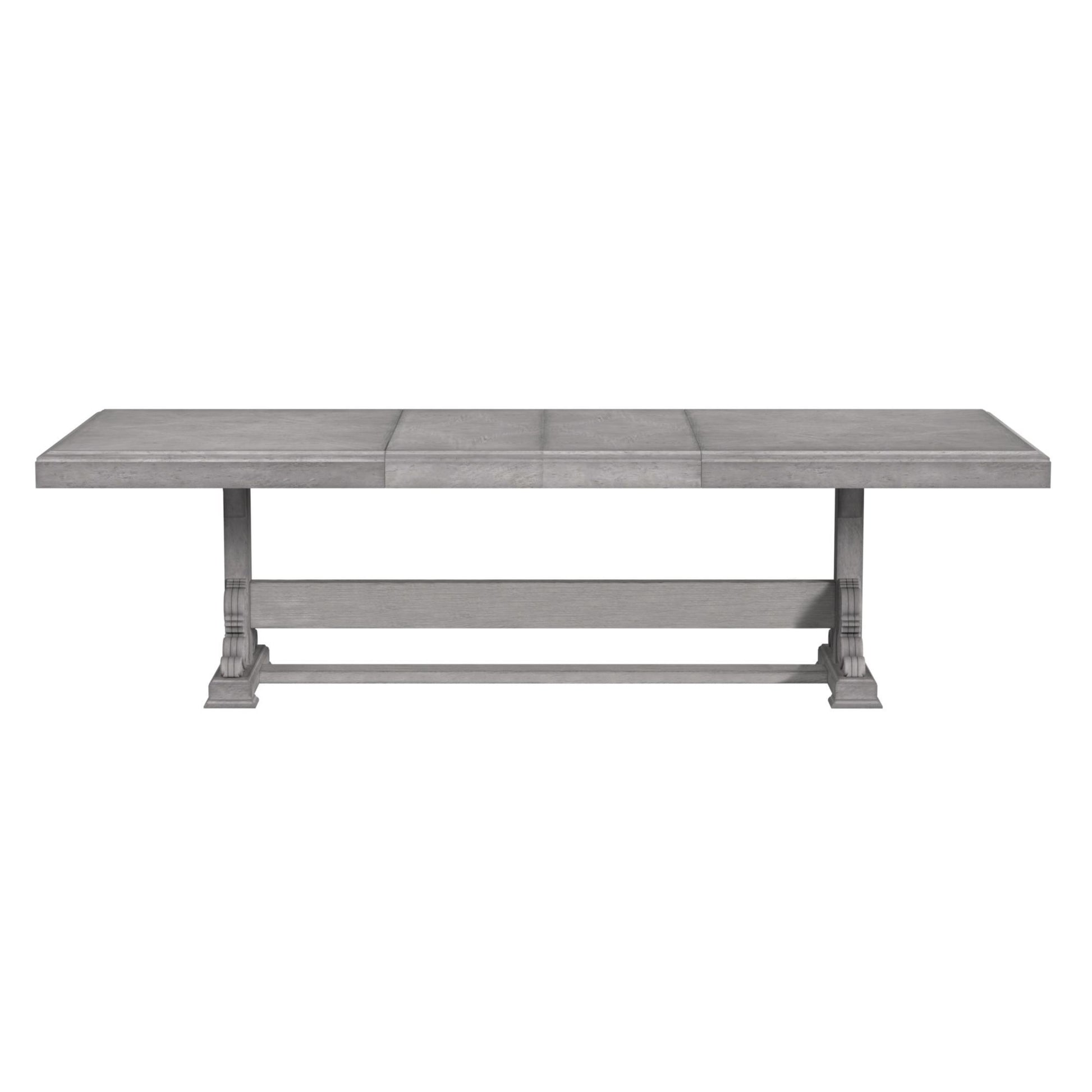 The grand Glenmore Dining Table invites elegance and heritage into your home, with its timeless design and aged, grey finish. The sturdy trestle base features exquisite carvings, embodying both strength and beauty, making it the perfect centerpiece for cherished family gatherings or refined dinner parties. Its generous length can be extended with two 18-inch leaves, effortlessly accommodating additional guests while preserving an intimate atmosphere. Gather around the magnificent Glenmore Dining Table and create lasting memories with guests, where every meal feels like a special occasion and every conversation endures just a little longer.