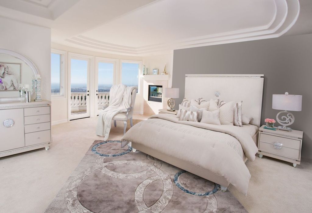 The dresser features a stainless steel medallion as the focal design element, with crushed crystallized facets. Drawers are framed with stainless steel and the piece is fully upholstered with high quality textured vinyl.