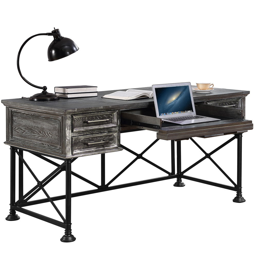 Whether you're working from home or just paying bills, you'll love the distinctive styling of this writing desk. Finished in a handsome Vintage Burnished Smoke paired with a metal-leg base, it features three storage drawers, a center drop-front keyboard drawer, a power center with USB ports, wire access holes for cord management and hidden storage.