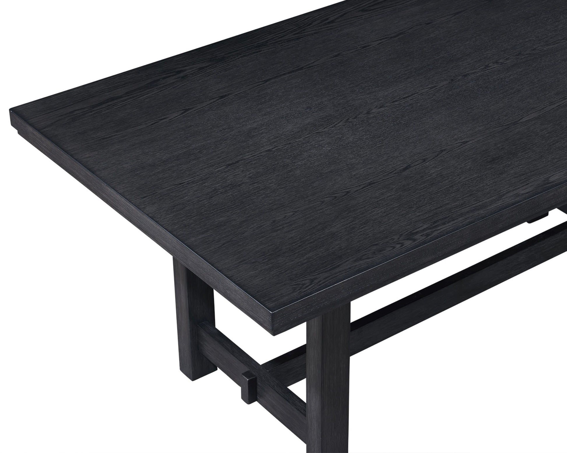 Elevate your dining experience with this contemporary dining group, where modern design meets rustic charm. Crafted with a rich, dark finish, the spacious rectangular table offers ample room for both intimate dinners and festive gatherings. The subtle grain detailing on the table's surface adds depth and character, while the trestle base ensures stability and longevity. Complementing the table are the sleek, slat-back chairs, designed for comfort and style with their plush upholstered seats. The accompanying bench, upholstered in a neutral hue, provides versatile seating options and further enhances the ensemble's chic appeal.
