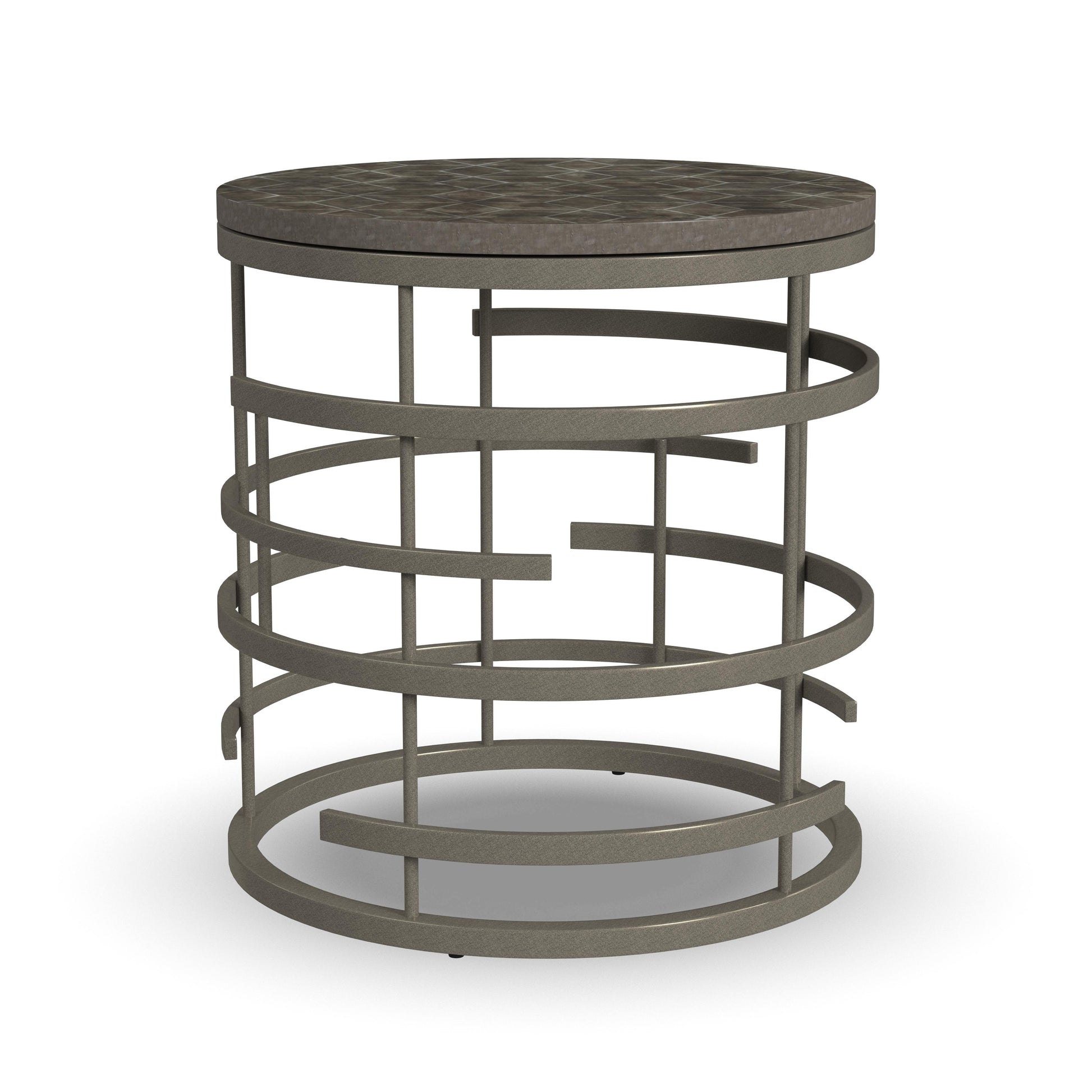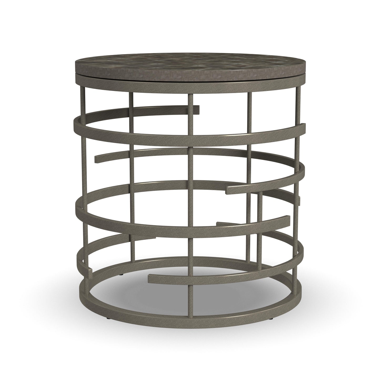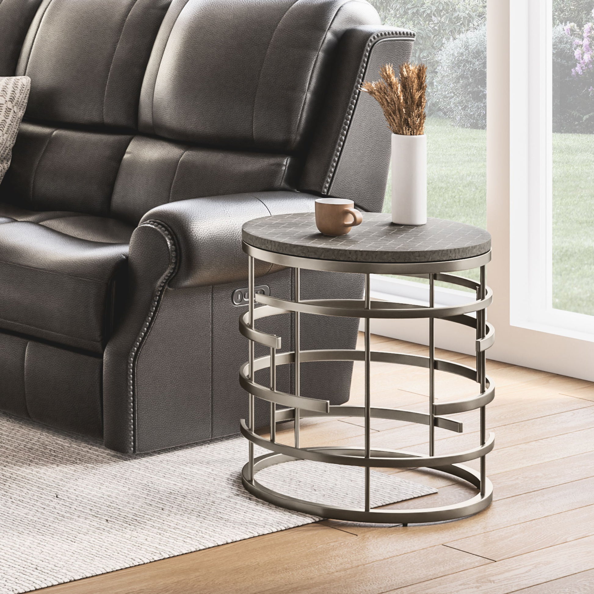 Halo’s industrial-inspired design features an antiqued concrete top surface with a beautiful diamond pattern detailing. Cylindrical metal bases with horizontal supports in a soft silver finish perfectly complement the top design. Add Halo to your home’s décor for a fashion-forward look.
