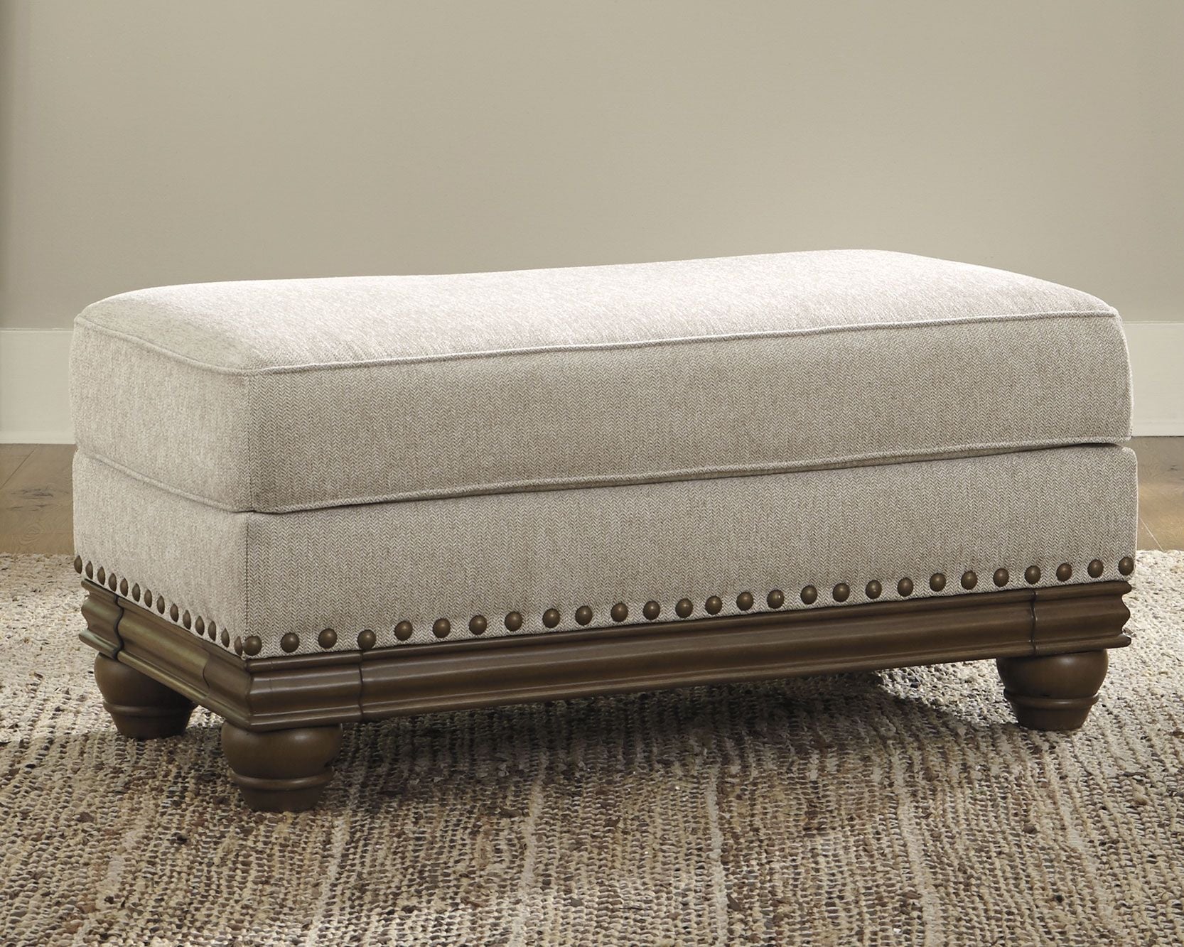 True classic character comes to life in this ottoman. Warm brown exposed frame with bun feet is beautifully traditional. Lovely detailing carries itself through the herringbone weave in the soft upholstery. Neutral tone lets you accessorize with any color. Vintage-inspired jumbo nailhead trim graces the design all around.