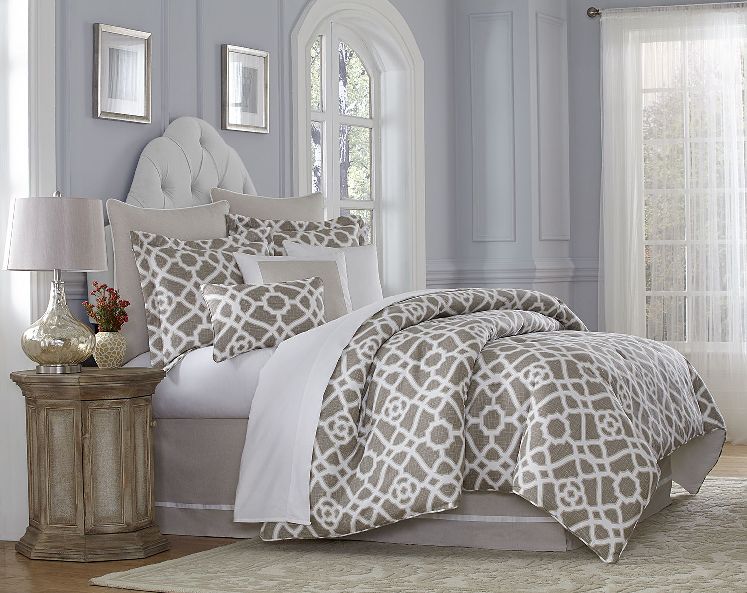 The Harper comforter set is ready to transform your timeless transitional style! This design is all about casual, relaxed comfort. The eye-catching quatrefoil pattern is printed on 100% cotton duck that looks crisp and cool. The shams have a 2" flange and are self-reversing with zipper closures, while the Euro shams have a linen blend face fabric and solid white cording. They reverse to the same white cotton duck for perfect flexibility and comfort. Reversible decorative pillows with hidden zippers and waterfowl feather inserts. Universal bed skirt features a lovely white contrast flange detail.