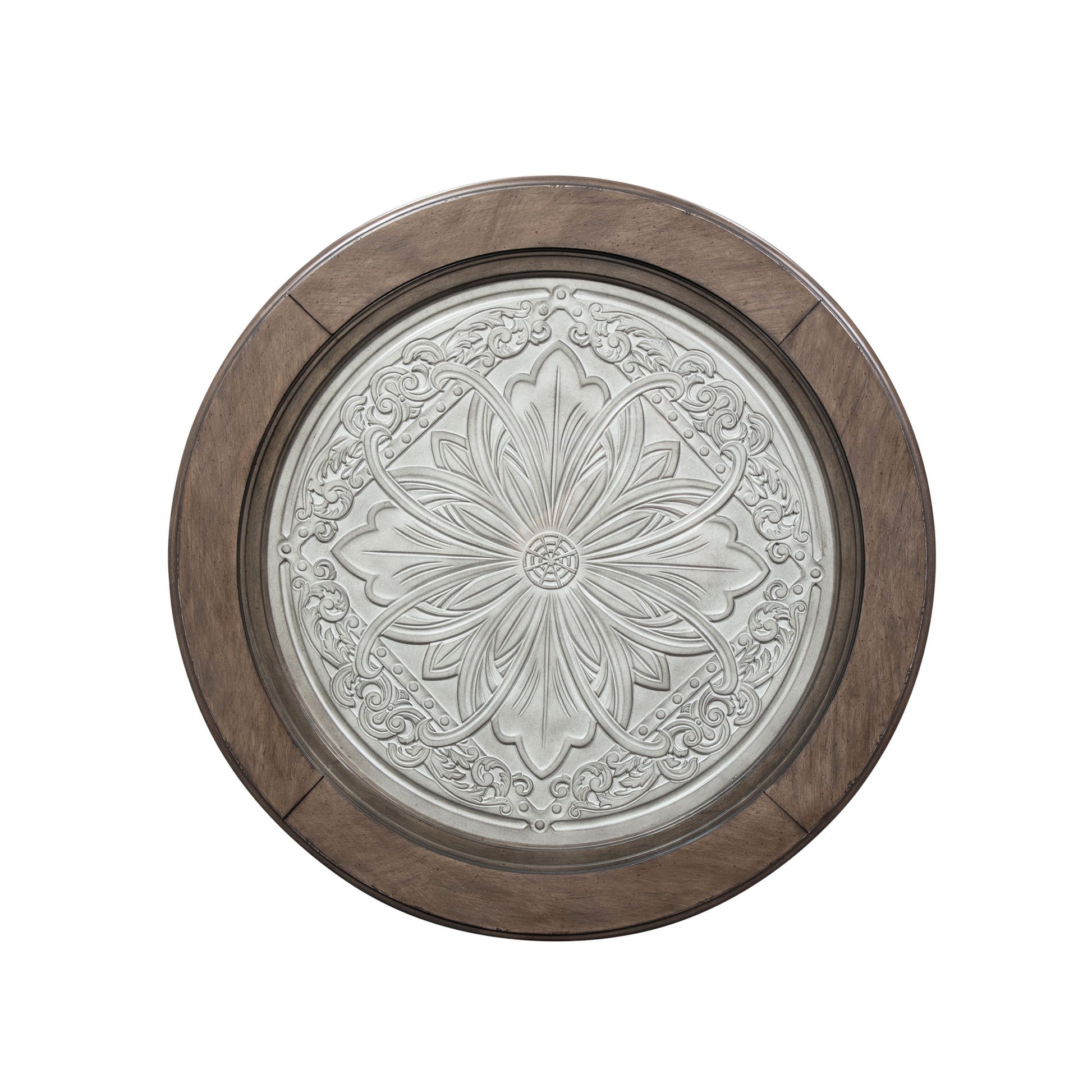 Accent your space with the Heartland round ceiling tile cocktail table. Crafted of rubberwood solids with cathedral white oak veneers, this piece features an antique white finish with a tobacco top, a bottom shelf for additional storage, appealing wood framed glass top with a decorative tile insert, anchored by square tapered legs with casters. This gorgeous cocktail table would make a great accent piece to any traditional or farmhouse space.