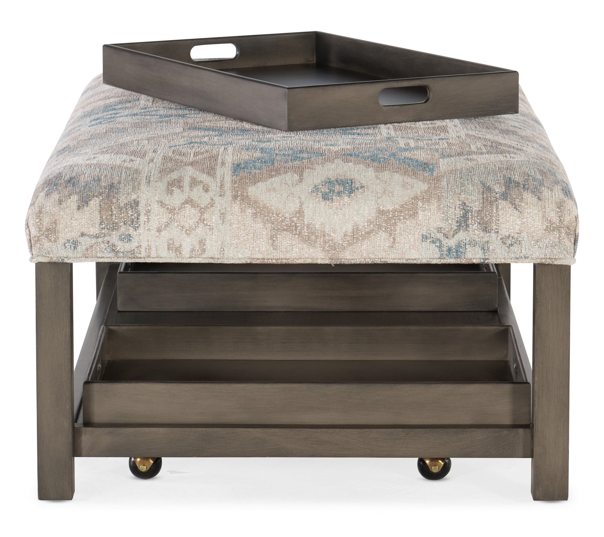 Introducing what we truly do best – great design, intricate, multi-step hand finishes and on-trend fabric offerings – to the occasional furniture category, the highly customizable Cocktails & More program offers a variety of options on eight upholstered cocktail tables, each of which include cocktail trays and casters. Available in round, square, oval or rectangle, the upholstered cocktail ottomans are available in a choice of more than 650 fabric options with tufted or non-tufted tops and a choice of eight finishes. An additional 15 Premier finishes – hand applied by our artisans – are also available, along with contrasting welt options and a choice of two sizes of nail-head detailing, available in four different finishes for further customization. Melding form with function, each style includes complementary solid wood serving trays for use in entertaining and hidden, locking casters for easy movement. The solid wood trays are crafted to nest on the cocktail ottomans’ bottom shelf for storage when not in use. Strategically placed wooden positioning pins on the bottom shelf help to lock the trays in place.