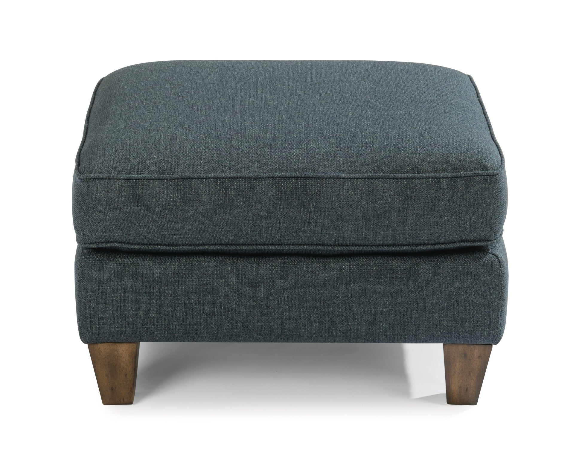 Welt cording displayed on a modern frame. Welt cording frames the soft cushion of the Holly ottoman for a fun, stylish effect and tall, tapered legs add visual height. Combine it with the Holly chair for extended relaxation.