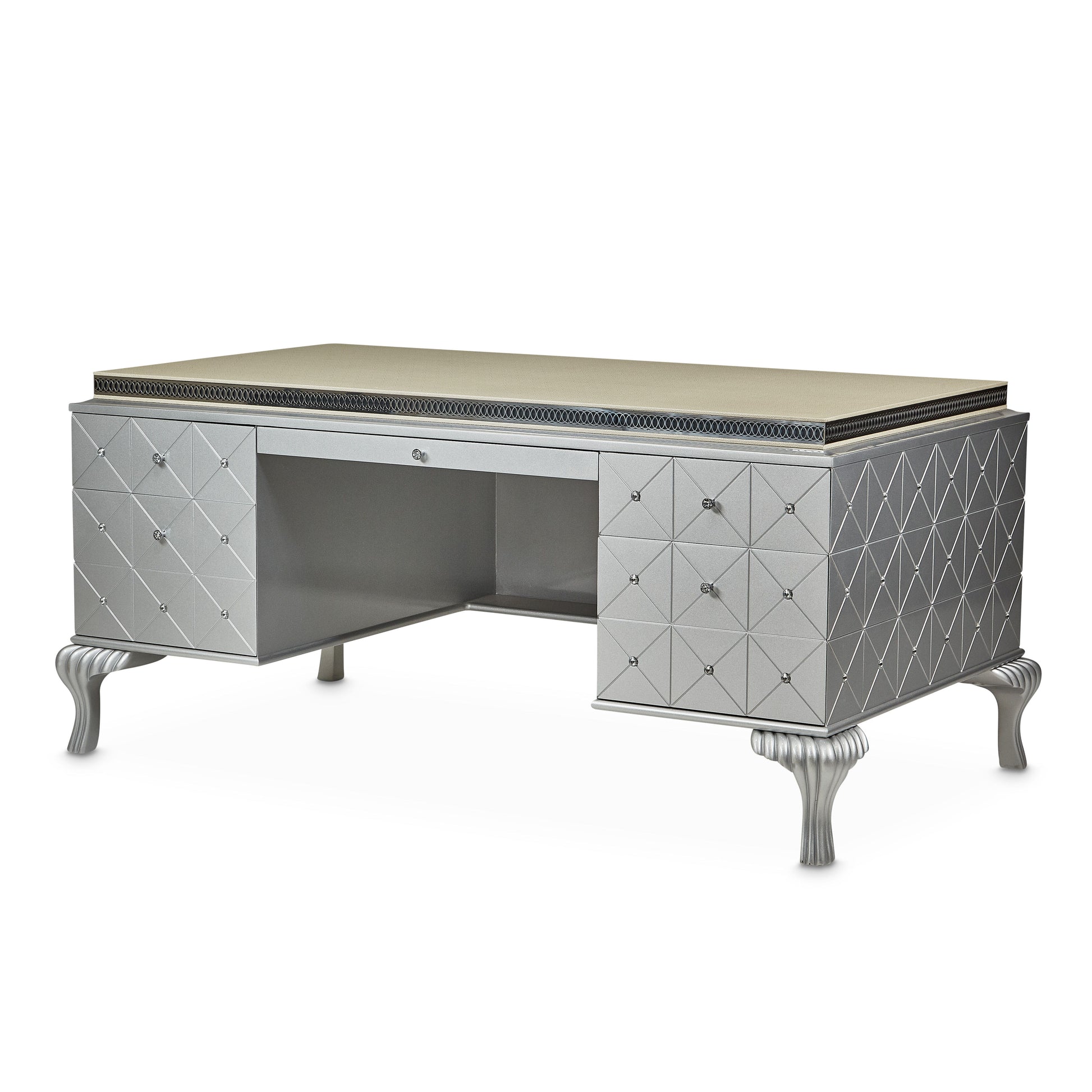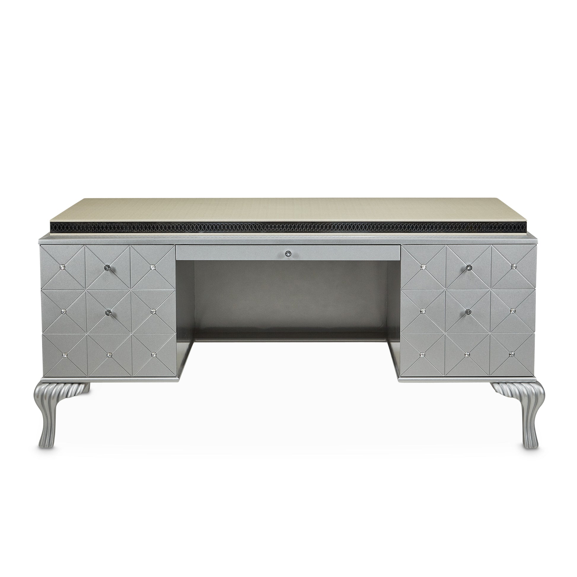 - Desk has 2 file drawers, 2 storage drawers, a pencil drawer, upholstered top, and geometric design with crystal accents