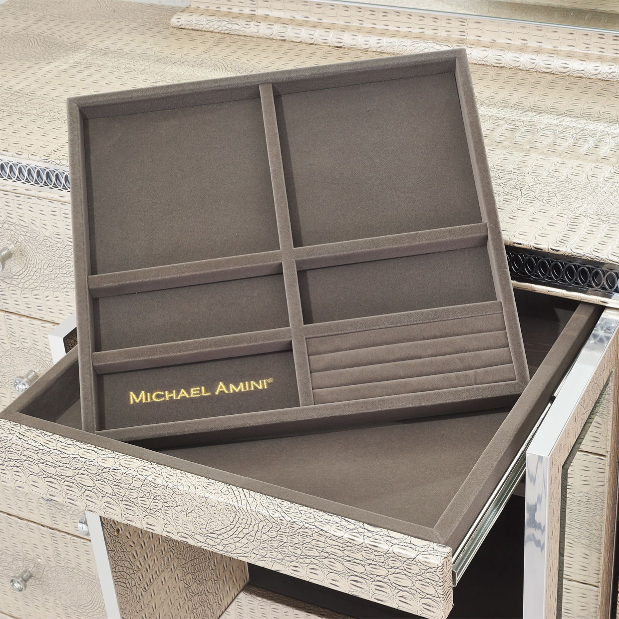 With a rich dialogue of supporting lines and elements, this dresser is bound to leave an impression in your room’s décor. This piece in a Crystal Croc finish features eight drawers, which are wonderful for keeping sweaters, jeans, undergarments, blankets or anything in need of convenient storage. Additionally, the two mirrored doors on the front add to the overall glamour of this specific piece. The Rectangular Mirror carries a Crystal Croc upholstered base and features a decorative design around the trim. This set will definitely elevate your home!