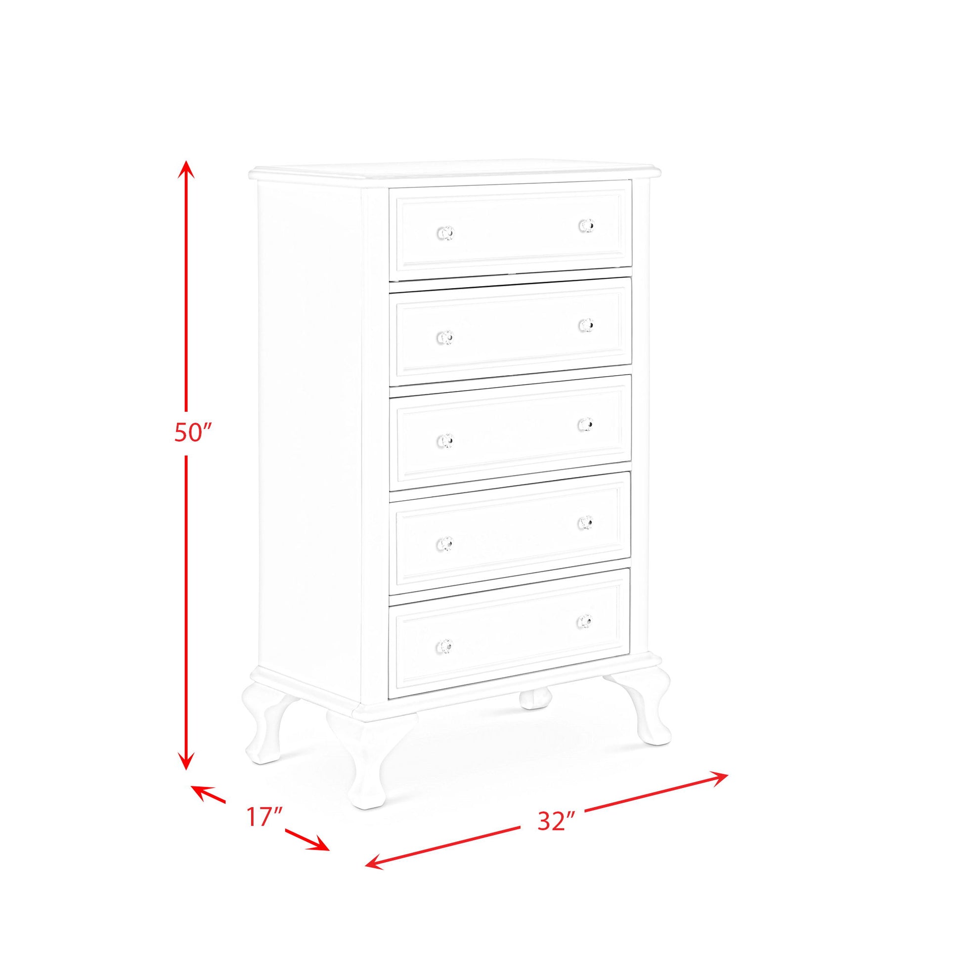 The Jesse 5-Drawer Chest is the perfect addition to your little ones bedroom! This vertical chest comes with five, spacious drawers; perfect for neatly storing away all of your belongings. Raised panel drawer fronts are accompanied by crystal-like drawer knobs, adding an extra element of style to this already stylish set. The classic white finish is easy to match with any existing decor. Bevel edges and arched cabriole feet complete the look of this transitional design.