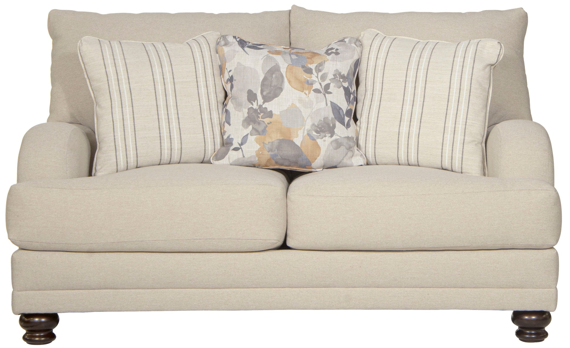 Jonesport is a Farmhouse Casual design and features a piqué weave body fabric and a variety of decorative toss pillows. The modified Charles of London arm, t-front seat cushions and companion floral print Accent Chair and Cocktail Ottoman complete the look.