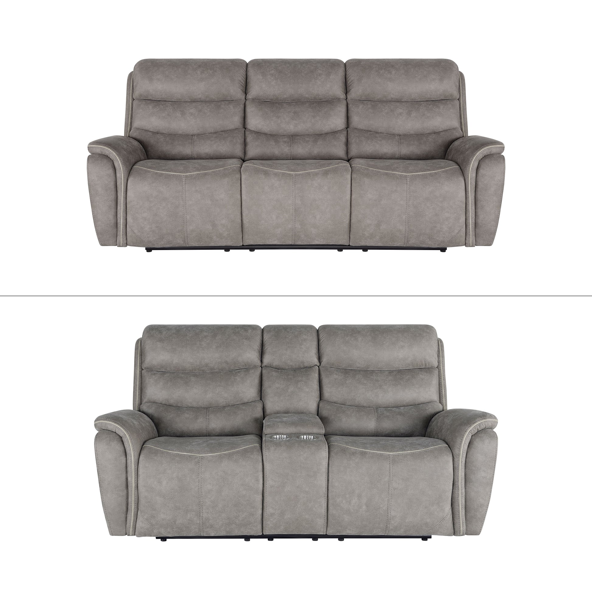 Indulge in the luxurious comfort of the Kamari Reclining Sofa Set. Crafted with a sumptuously soft dappled gray upholstery, this set invites you to sink into relaxation. Tailored to perfection, its triple roll backs, bucket seats, and wrap-around arms exude sophisticated style, accentuated by tasteful contrasting welt detailing. Recline and unwind with fully upholstered chaise recliner footrests, offering unparalleled comfort. Built for lasting support, hardwood and manufactured wood frames, coil spring cushions, and resilient foam ensure durability and coziness for years to come. Convenience meets style with the loveseat''s center console for remote storage and built-in cupholders for your beverages. Versatile in design, whether your taste leans contemporary or traditional, this set effortlessly complements any decor.